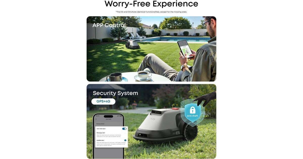 - Automatyczne mapowanie: E15 mapuje ogród i planuje trasę koszenia. 🗺️