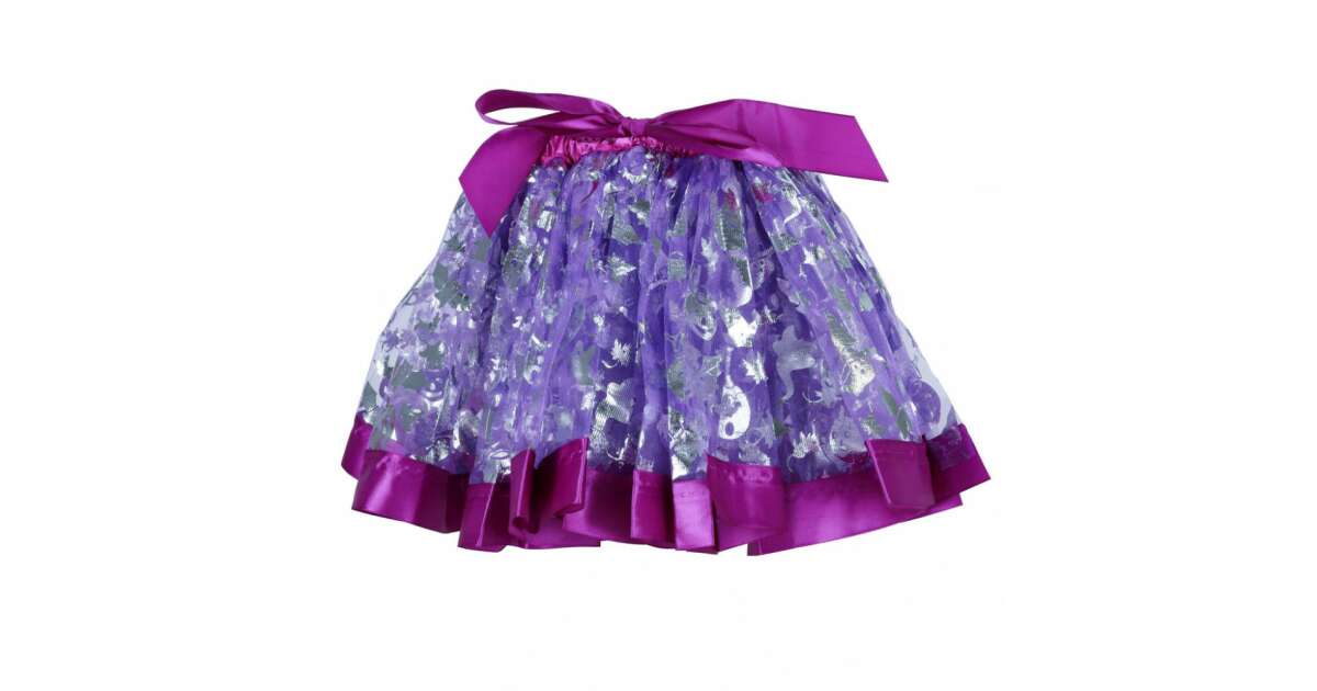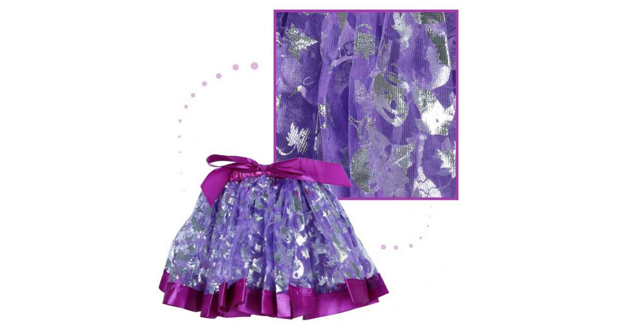 - Fioletowa tiulowa spódniczka z srebrnym wzorem i bordową wstążką