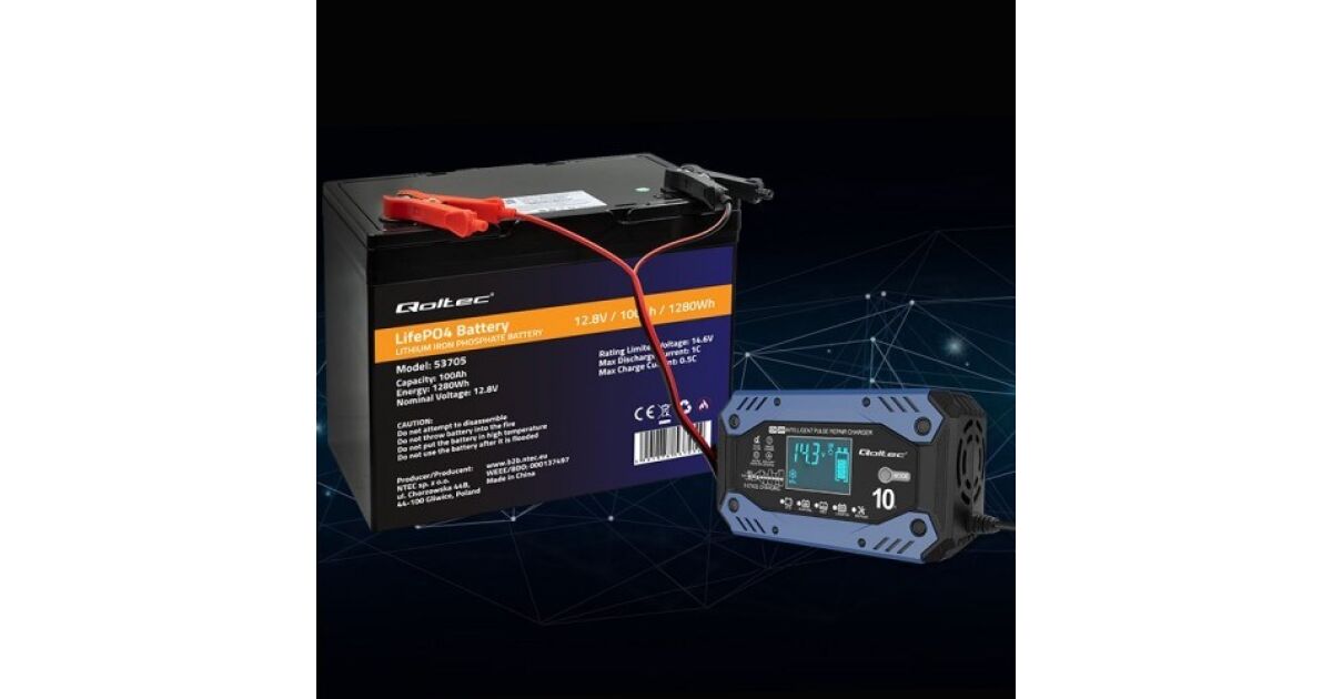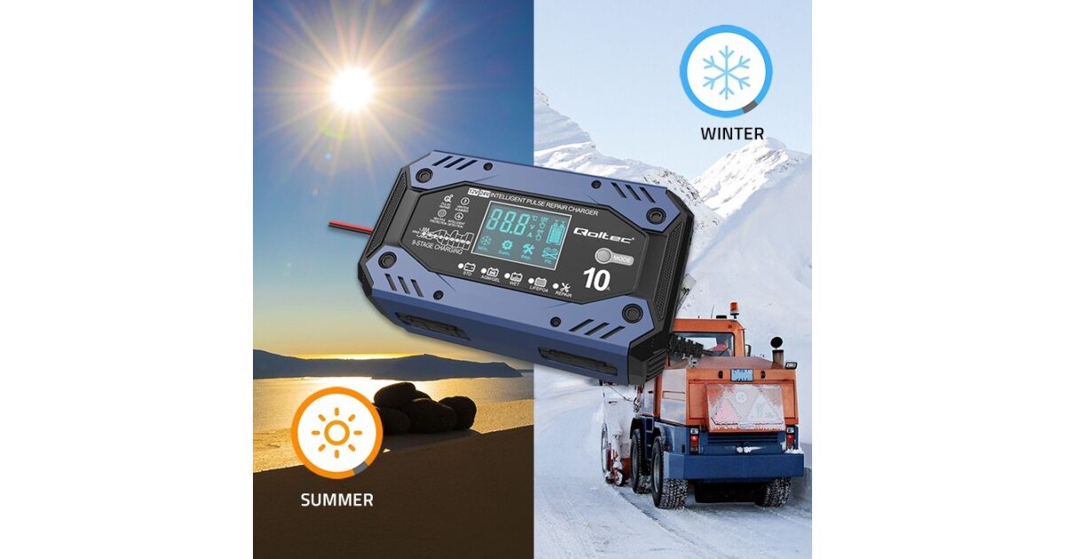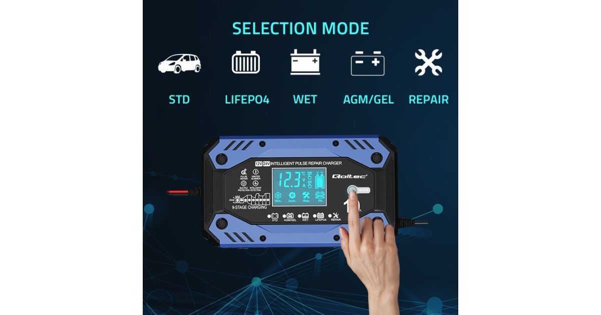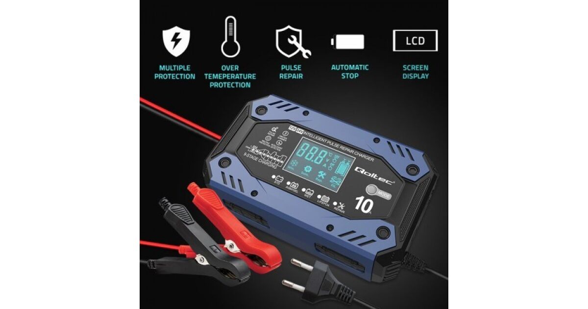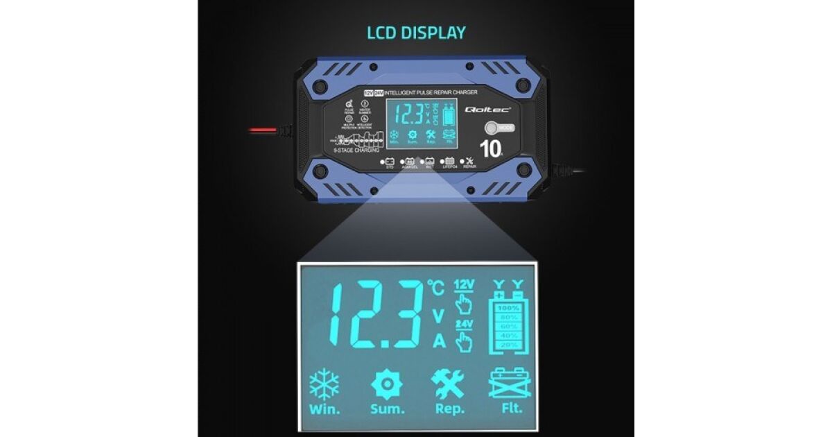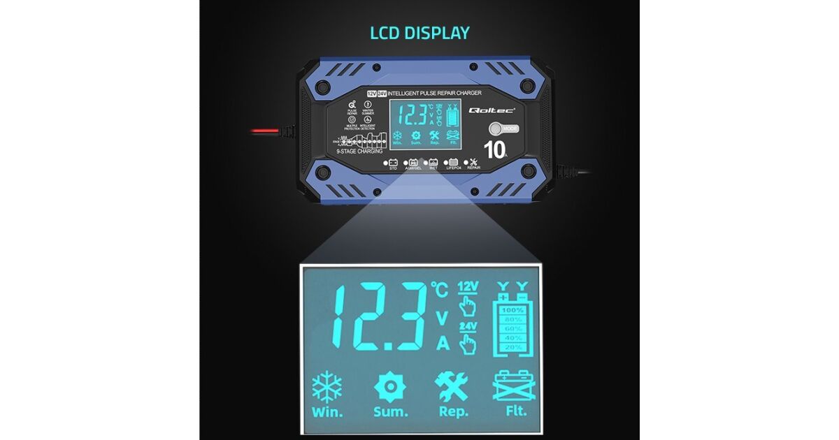 Qoltec Inteligentna ładowarka do akumulatora STD AGM GEL LiFePO4 | Prostownik z funkcją naprawy |12-24V |10A | LCD | 9 - stopniowe ładowanie opis