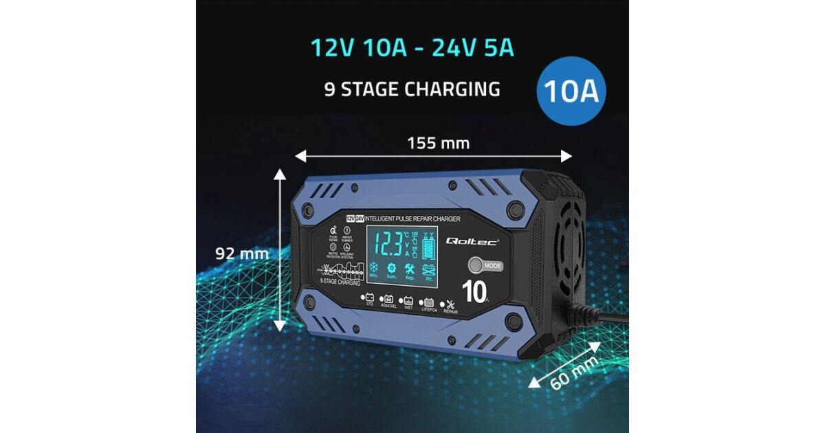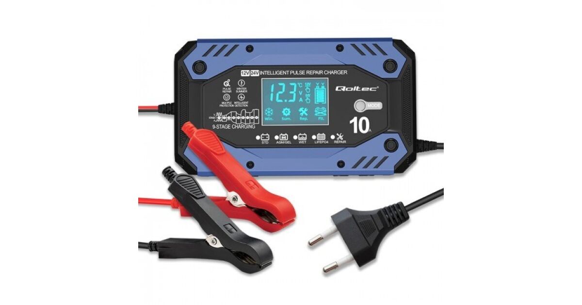 Qoltec Inteligentna ładowarka do akumulatora STD AGM GEL LiFePO4 | Prostownik z funkcją naprawy |12-24V |10A | LCD | 9 - stopniowe ładowanie