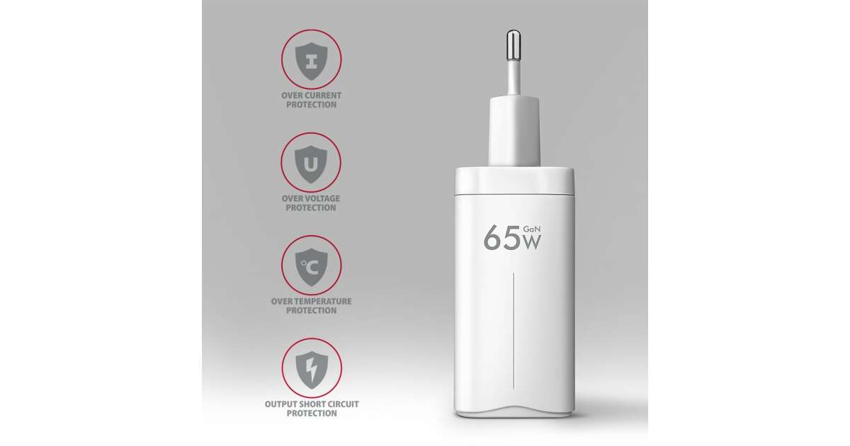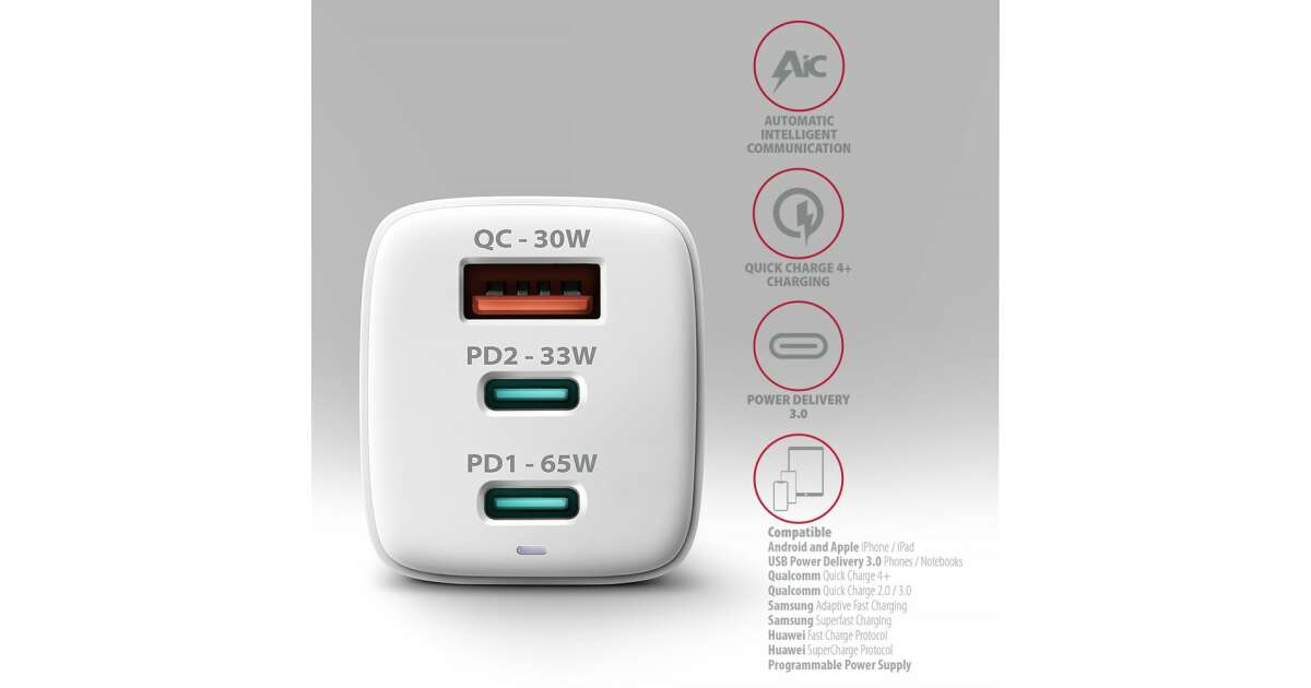 ACU-DPQ65W Ładowarka sieciowa GaN 65W, 3x port (USB-A + dual USB-C) PD3.0/QC4+/PPS/Apple, biała
