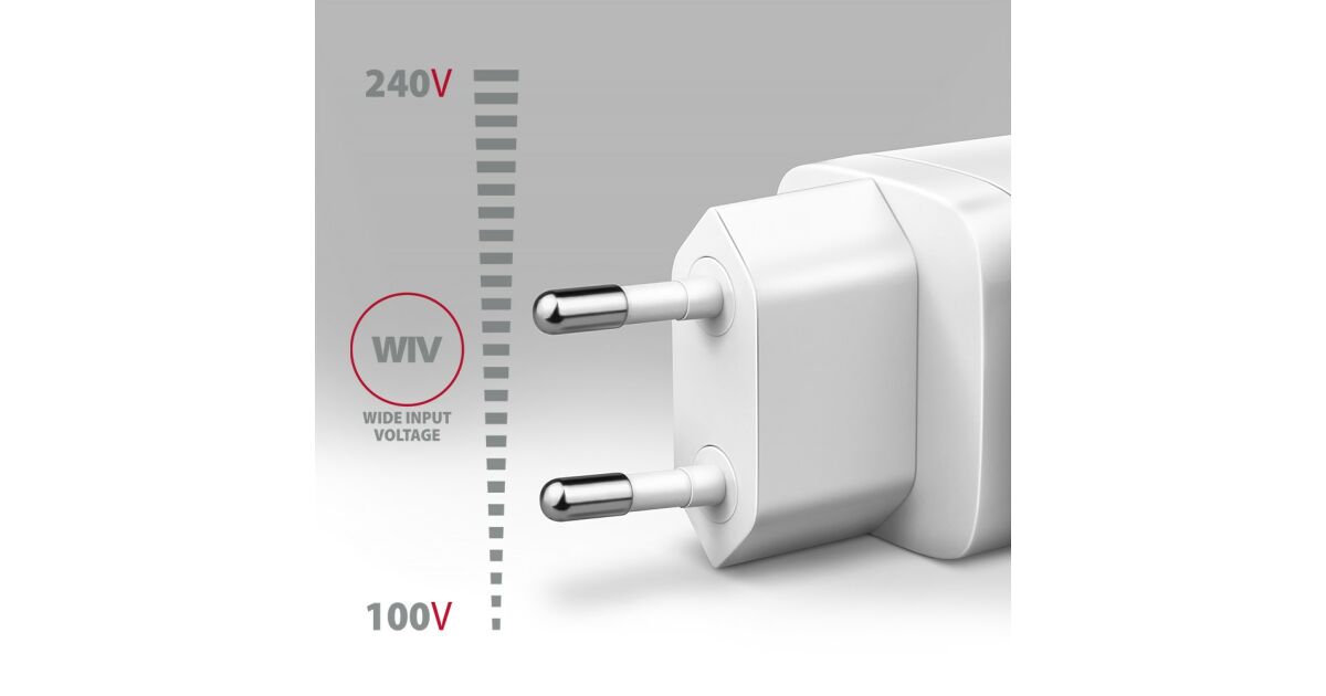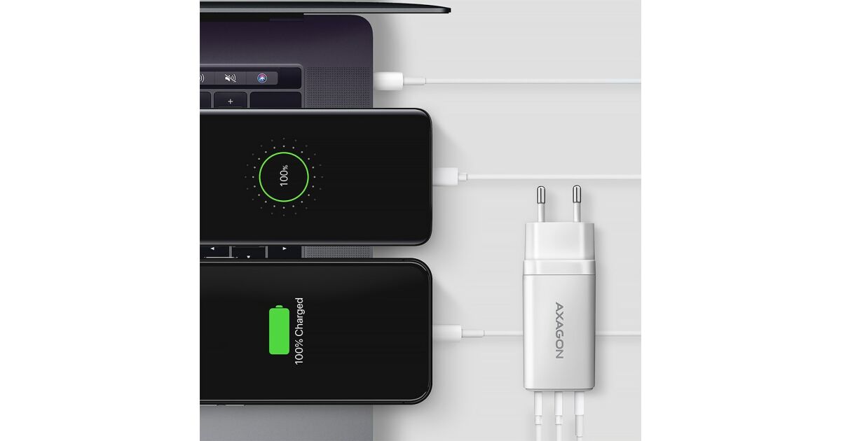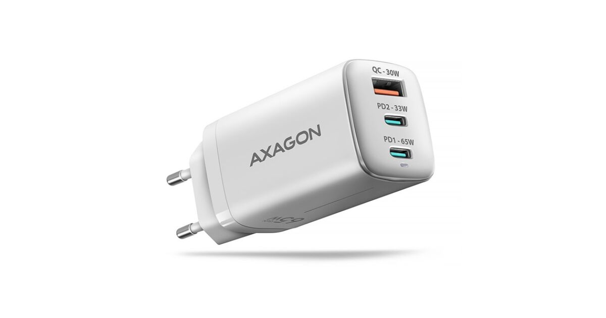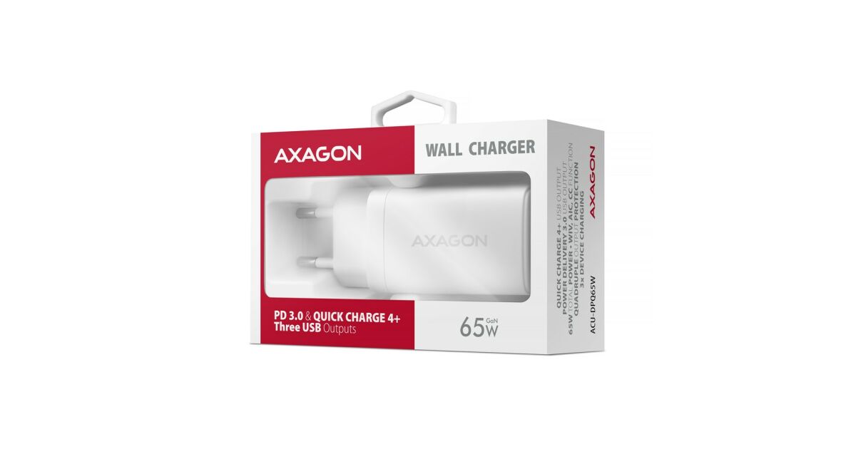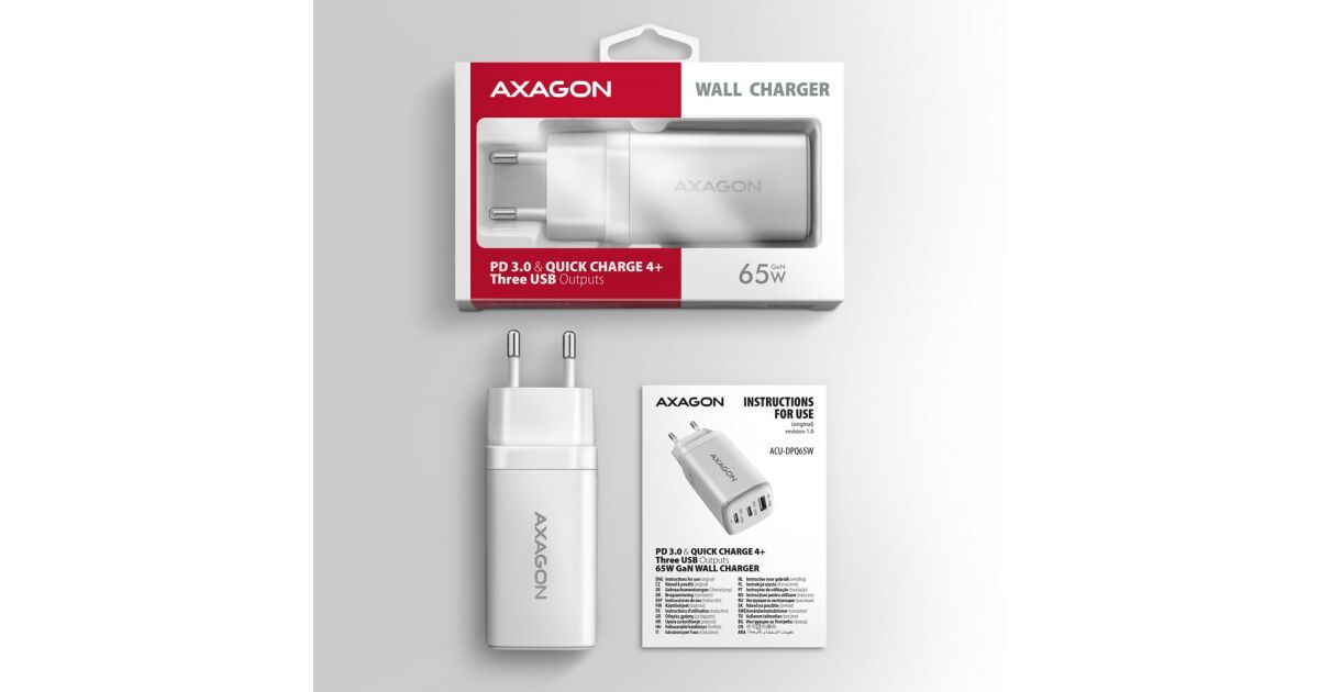 Axagon ACU-DPQ65WPodróżna ładowarka sieciowa AXAGON ACU-DPQ65W GaN umożliwia szybkie ładowanie do trzech urządzeń mobilnych jednocześnie. Dzięki mocy całkowitej 65W ładowarka potrafi ładować notebooki, telefony i inne urządzenia mobilne z najwyższą możliwą prędkością. Adapter oferuje jedno standardowe złącze USB-A oraz dwa złącza USB-C.Kompaktowy rozmiar i wysoką wydajność zapewnia zastosowanie nowej technologii GaN. Komponenty z azotkiem galu oferują wysoką wydajność, co pozwala na osiągnięcie lepszych efektów przy niewielkich rozmiarach. Ładowarka wyposażona jest w dwa wyjścia Power Delivery 3.0 / Quick Charge 4+ USB Type-C i jedno wyjście Quick Charge 3.0 USB Type-A, co umożliwia szybkie ładowanie nie tylko smartfonów i tabletów, ale także laptopów.