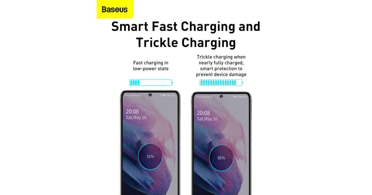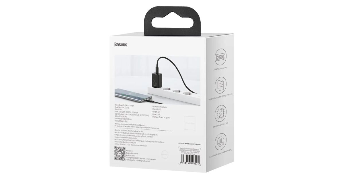Technologia Baseus Super Si pozwala na połączenie małych rozmiarów z wysoką wydajnością. Wbudowany inteligentny system automatycznie dostosowuje prąd ładowania do urządzenia, optymalizując proces ładowania i chroniąc je przed uszkodzeniem. Obudowa z tworzywa ABS przyczynia się do efektywnego odprowadzania ciepła.