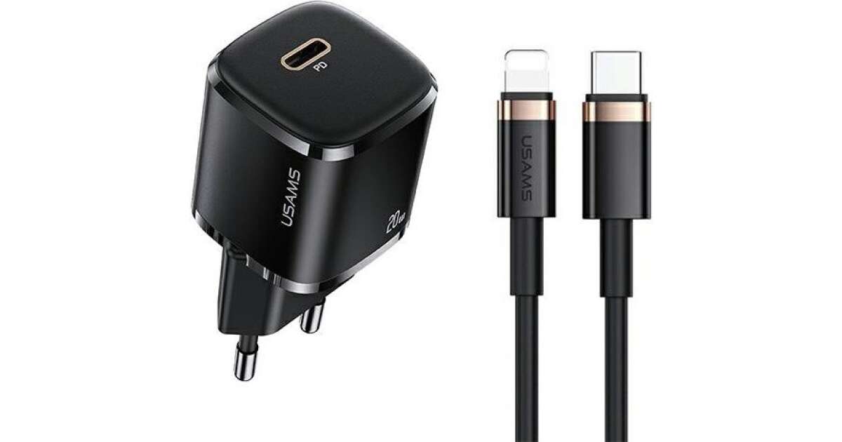 USAMS Ład. siec. 1xUSB-C T36 mini 20W+ kabel USB-C-Lightning czarny/black PD3.0 Fast Charging XFKXLOGTL01 (US-CC124+US-SJ484)