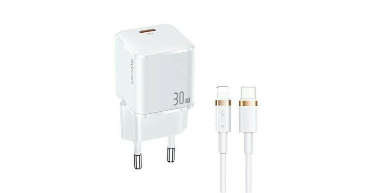 USAMS Ład. siec. 1xUSB-C T45 30WPD3.0 Fast Charging +kabel U63 USB-C/Lightning biały/white UXTZH02 (USAMS-UX)
