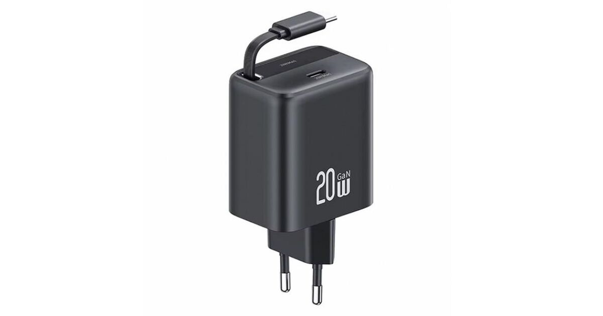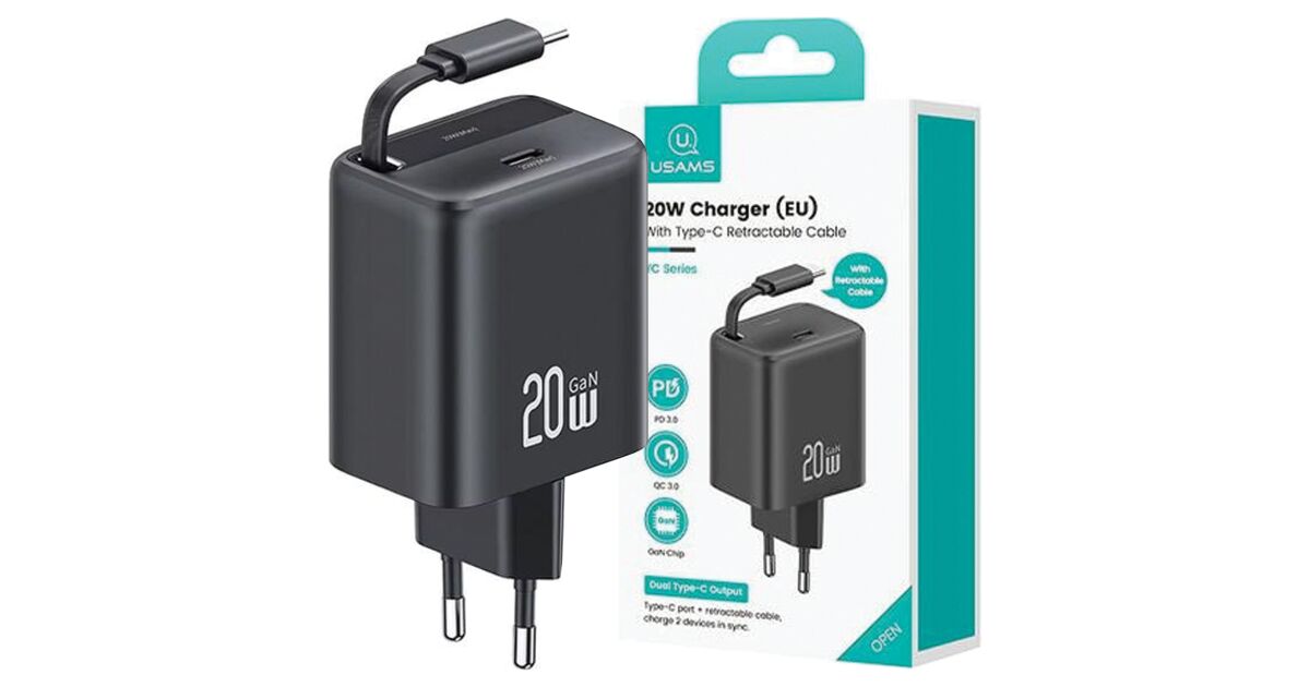 USAMS Ład. siec. 1xUSB-C ze zwijanymkablem USB-C Retractable PD+QC 20W Gan Fast Charging czarny/black YC Series CC233TC01 (US-CC233)