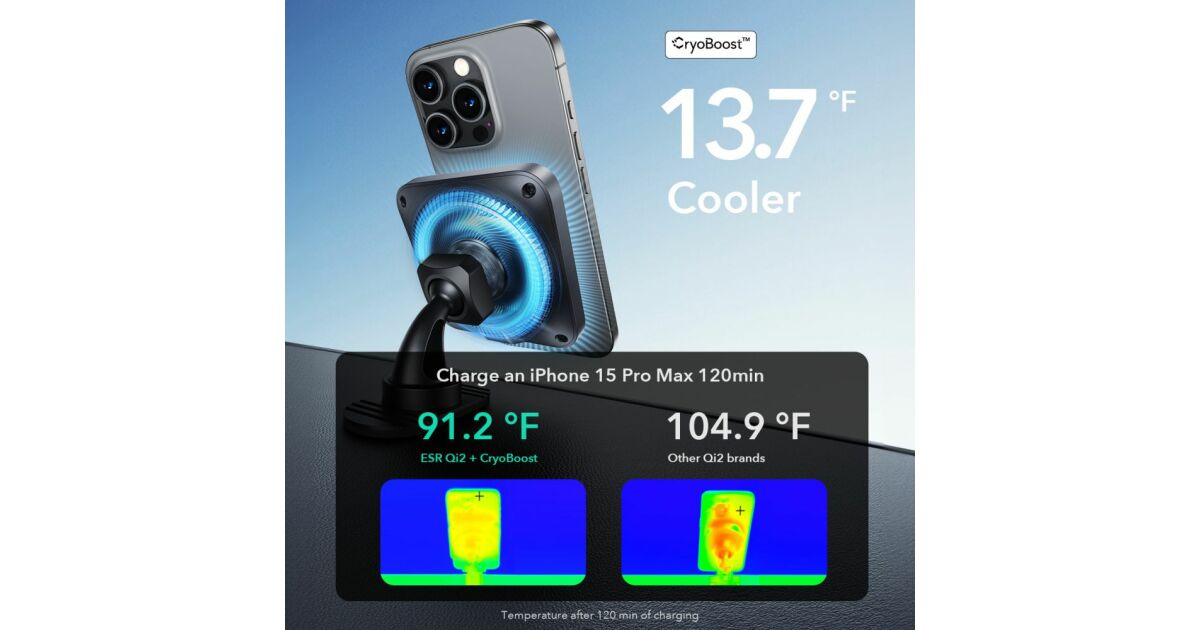 Ładowarka samochodowa ESR HaloLock Qi2 Wireless z CryoBoost oferuje zaawansowaną technologię bezprzewodowego ładowania, zgodną ze standardem Qi2. Umożliwia szybsze ładowanie dzięki systemowi chłodzenia, który zapobiega przegrzewaniu się urządzeń.