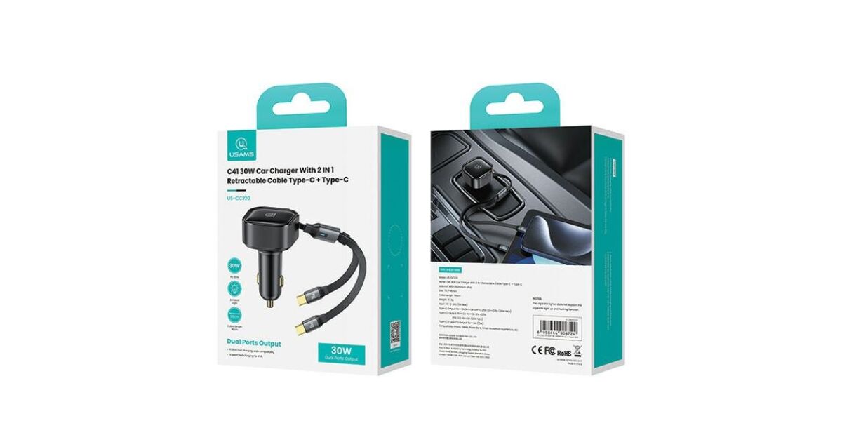 Ładowarka samochodowa ze zwijanym kablem Usams US-CC220 Ładowarka Usams US-CC220 to rozwiązanie idealne dla osób, które dużo podróżują i muszą mieć przy sobie ładowarkę, która będzie pewnym źródłem zasilania w trakcie podróży dla więcej niż jednego urządzenia. Wygodne i przenośne rozwiązanie Ładowarka Usams to niezwykła wygoda w trakcie podróży Twoim samochodem. Urządzenie zostało wyposażone w wbudowany zwijany kabel, który działa na zasadzie taśmy rozszerzającej, dzięki czemu z łatwością dostosujesz długość kabla do własnych potrzeb. Oba kable umożliwiają jednoczesne szybkie ładowanie. Naładuj szybko swój telefon!Ładowarka posiada kabel 2w1, którego łączna moc wyjściowa to 30 W. Oba porty USB-C obsługują technologię szybkiego ładowania Power Delivery (PD), Quick Charge (QC), Super Charge Protocol (SCP) czy Fast Charge Protocol (FCP), dzięki czemu można tą ładowarką naładować szybko naprawdę wiele różnych telefonów, takich jak Apple, Huawei, Xiaomi czy Samsung. Potrójna ochrona dla bezpieczeństwa Zapewnij sobie spokój podczas ładowania dzięki potrójnej ochronie ładowarki USAMS. Obejmuje ona wiele funkcji, takich jak zabezpieczenia przed zwarciem, nadprądem, nadmiernym napięciem, przeciążeniem mocy, a także ochronę przed przegrzaniem, zapewniając kompleksową ochronę dla Twojego urządzenia. Dane Techniczne Materiał Stop aluminium Wymiary 76,3 x 46 mm Waga Około 70g Kolor Czarny Długość kabla 90 cm Wejście DC 12-24V (5A Max) Wyjście USB-C1 5V-3A 9V-3A 10V-2,25A 12V-2,5A (30W max) Wyjście USB-C2 5V-3A 9V-3A 12V-2,5A PPS:3,3-11V-3A (33W max) Wyjście USB-C1 + USB-C2 5V-3A 15W Moc wyjściowa 30W max Kompatybilność Dla urządzeń cyfrowych Dodatkowe informacje Uwaga: Produkt ma zastosowanie tylko dla większości samochodów z zapalniczką samochodową i napięciem wejściowym 12V-24V. Nieodpowiednie dla ciężarówek, koparek i innych pojazdów z napięciem większym niż 24V.