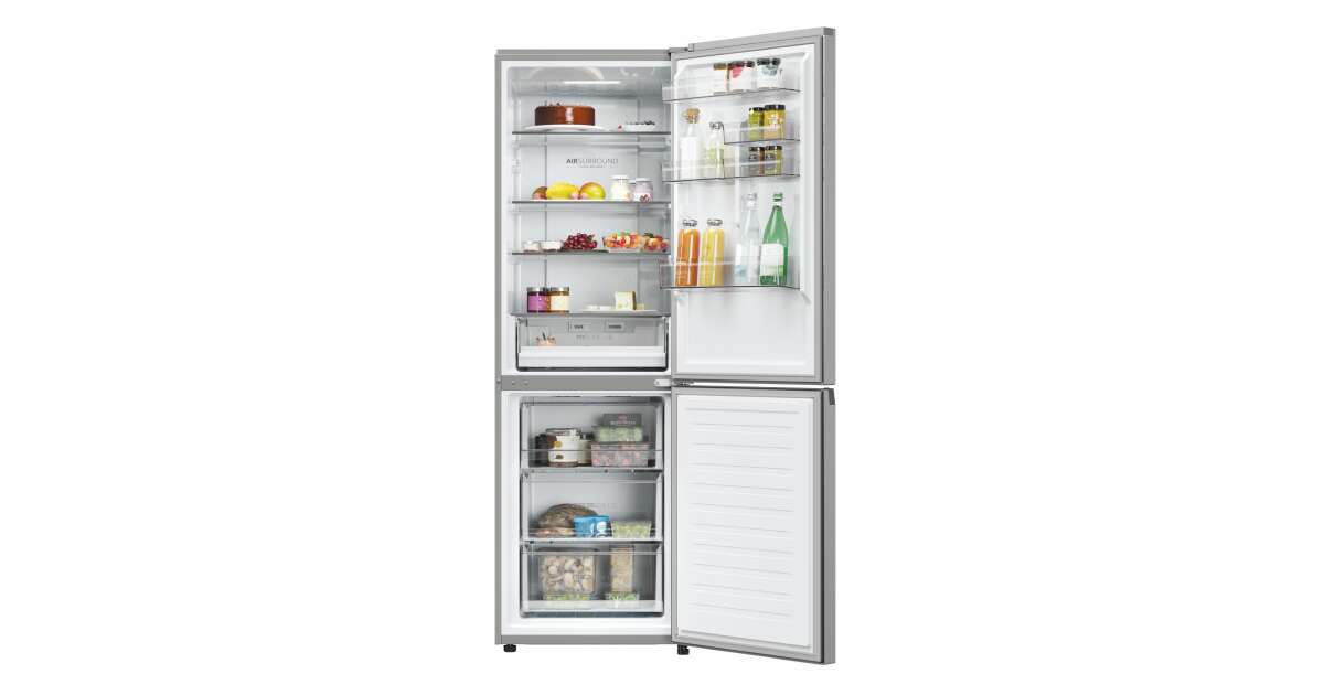Dzięki Haier Air Surround Fresher Tech powietrze przepływa łagodniej wewnątrz lodówki. Dzięki specjalnym bocznym otworom system ten równomiernie rozprowadza zimne powietrze, które otula żywność wewnątrz lodówki, unikając bezpośredniego przepływu zimnego powietrza na żywność, zapobiegając utracie wagi i odwodnieniu. W ten sposób Haier Air Surround zachowuje do 99% smaku, tekstury i soczystości żywności, a po 7 dniach będzie ona tak samo świeża, jak w dniu 1. Wyniki testów zostały opublikowane przez niezależne zewnętrzne laboratorium techniczne porównujące lodówkę z technologią Total No Frost Circle+ z lodówką z technologią bezpośredniego przepływu.