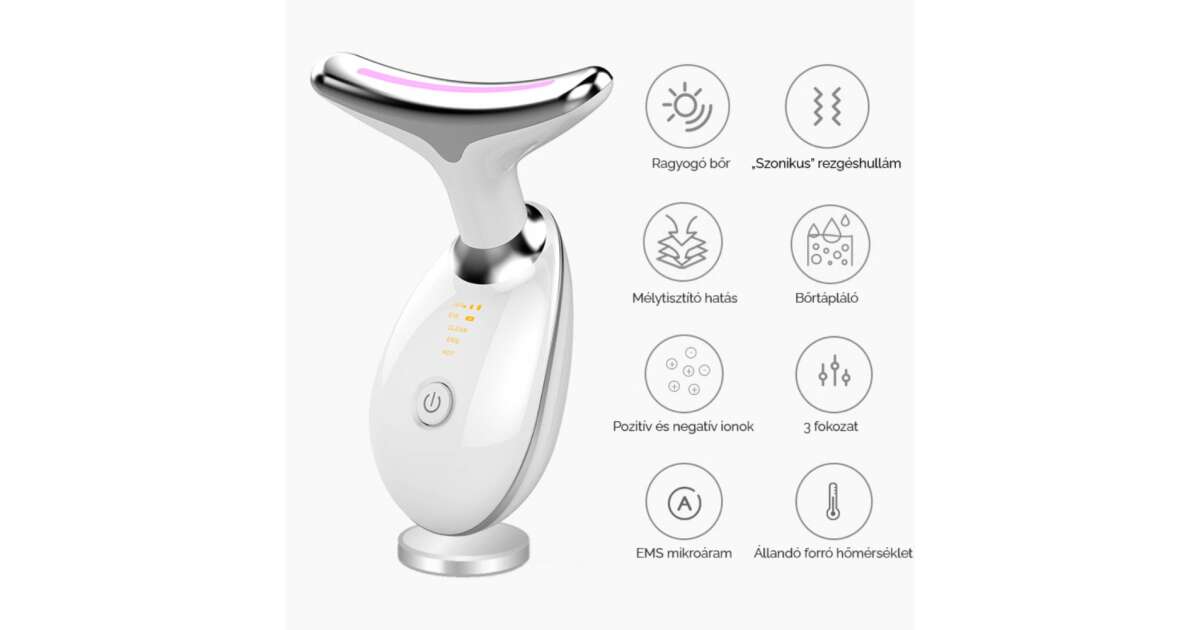 Ten innowacyjny masażer do twarzy i szyi łączy w sobie terapię światłem, wibracje soniczne i przyjemne ciepło (45°C), aby pomóc zmniejszyć zmarszczki, ujędrnić skórę i głęboko ją oczyścić. Klienci potwierdzili również skuteczność urządzenia i dobry stosunek jakości do ceny.