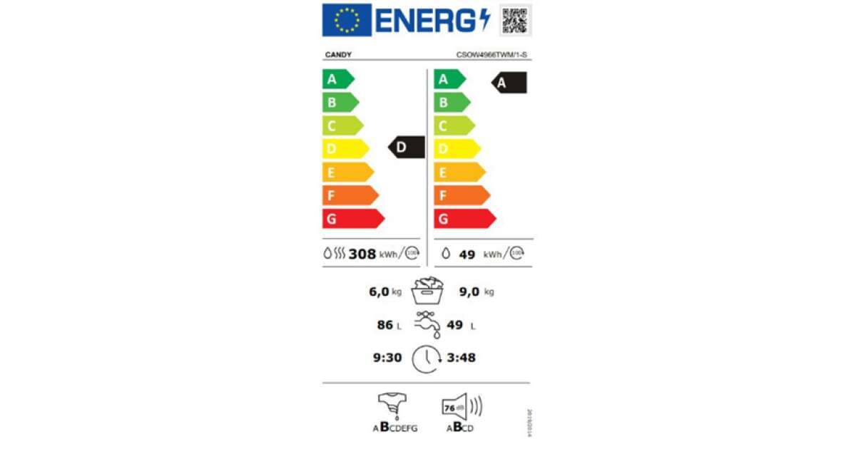 Pralko-suszarka Candy CSOW4966TWM/1-S, 9 kg - 6 kg, 1400 obr/min, 16 programów, Mix Power System, klasa energetyczna D