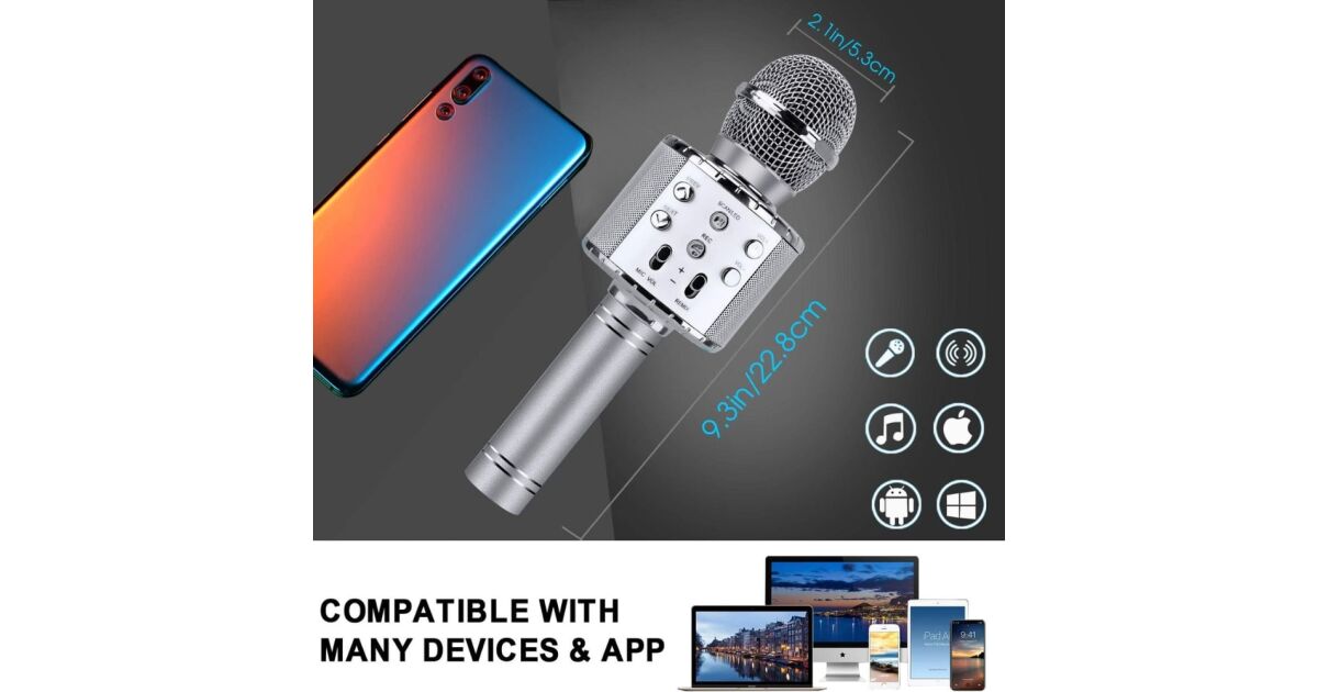 5 w 1 przenośny mikrofon karaoke dla dzieci, z Bluetooth, głośnikiem, USB, kartą SD i kompatybilny z aplikacjami karaoke, srebrny srebrny opis
