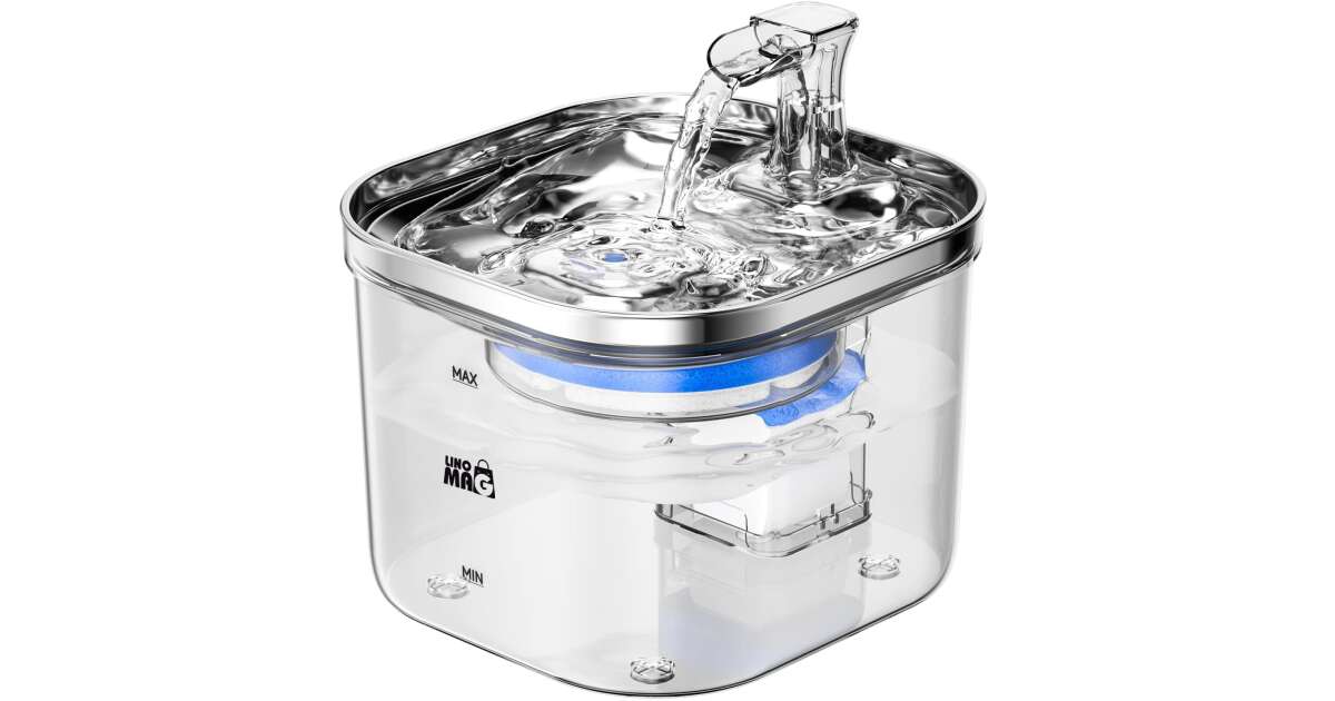 Automatyczny dystrybutor wody, typ fontannowy dla kotów i psów, Linomag®, Oczyszczanie i filtracja wody, Stal nierdzewna, Kontrola przepływu, 2L, Przezroczysty