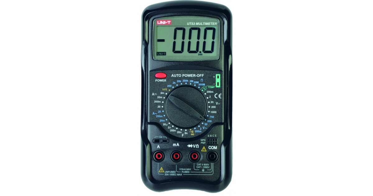 Miernik uniwersalny UT53Miernik Uni-T UT53 to solidne i wszechstronne narzędzie pomiarowe, idealne do szerokiego zakresu zastosowań w elektronice i elektrotechnice. Dzięki zaawansowanym funkcjom oraz dokładnym pomiarom, UT53 sprawdzi się zarówno w profesjonalnych pracach serwisowych, jak i w domowych warsztatach. Szerokie możliwości pomiaroweUT53 umożliwia precyzyjne pomiary napięcia stałego do 1000 V oraz zmiennego do 750 V. Miernik oferuje również możliwość pomiaru natężenia prądu stałego do 20 A oraz prądu zmiennego do 20 A, co sprawia go wszechstronnym narzędziem w diagnostyce i naprawach instalacji elektrycznych. Urządzenie umożliwia także pomiar rezystancji do 200 MOhm, pojemności do 20 ?F oraz temperatury w zakresie od -20°C do 1000°C, co sprawia, że jest przydatne w szerokim spektrum zastosowań. Praktyczne funkcje dodatkoweMiernik UT53 został wyposażony w funkcję ręcznej zmiany zakresów pomiarowych, co pozwala na dokładne dostosowanie ustawień do konkretnej potrzeby. Dodatkowe funkcje, takie jak wskaźnik niskiego poziomu baterii oraz automatyczne wyłączanie, zwiększają wygodę użytkowania i oszczędzają energię. Urządzenie oferuje także możliwość testowania diod, pomiaru hFE tranzystorów oraz sprawdzania ciągłości obwodu, co sprawia go uniwersalnym narzędziem do różnorodnych zastosowań. Solidna konstrukcja i ergonomiczny designUT53 charakteryzuje się trwałą konstrukcją oraz ergonomicznym designem, co zapewnia komfort i niezawodność podczas pracy. Duży wyświetlacz o rozmiarze 33 x 65 mm (3 1 cyfry) gwarantuje czytelność odczytów, a waga 580 g oraz wymiary 190 x 88 x 34 mm sprawiają, że urządzenie jest wygodne w użytkowaniu i łatwe do przenoszenia. Miernik zasilany jest baterią 9 V (6F22), co zapewnia długotrwałą pracę. W zestawie z UT53 znajdują się bateria, przewody pomiarowe, sonda do pomiaru temperatury oraz holster, co pozwala na natychmiastowe rozpoczęcie pracy i zapewnia dodatkową ochronę urządzenia.