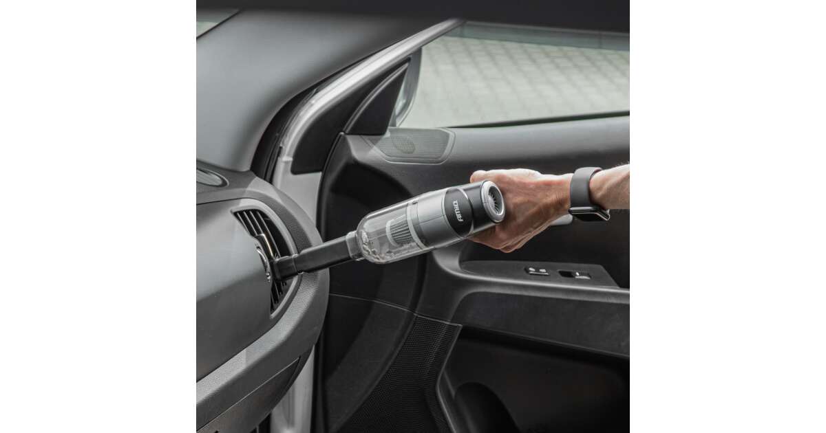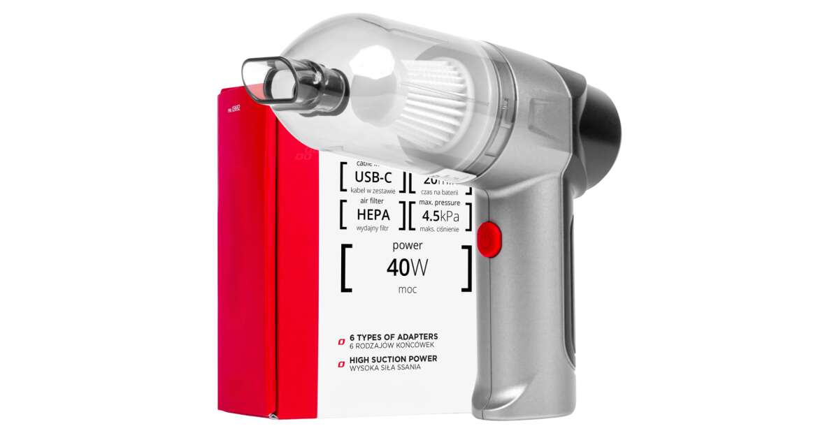 Odkurzacz samochodowy PREMIUM bez worka, z filtrem HEPA, ładowaniem USB-C, moc 40W, podciśnienie 4,5kPa, 6 głowic ssących, przenośny, kompaktowy i nowoczesny design, szary, EALMEU opis