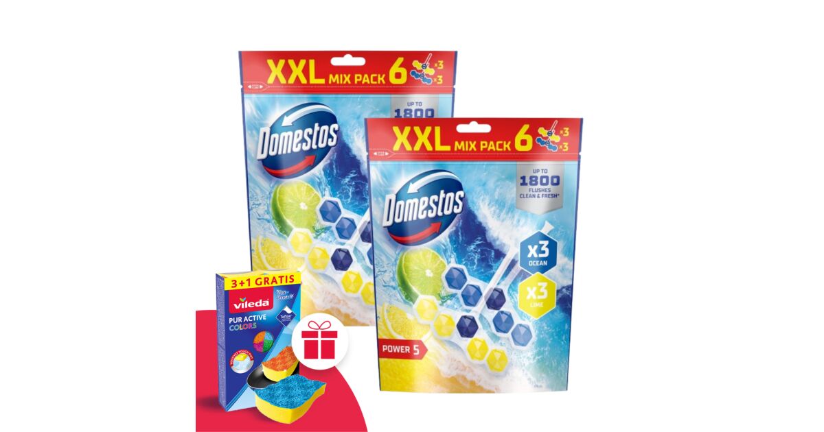 Domestos Power5 Kostka odświeżająca do toalet Lime & Ocean (12x50g) + Gąbka Vileda w prezencie