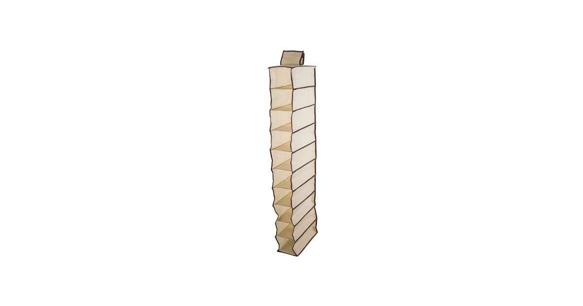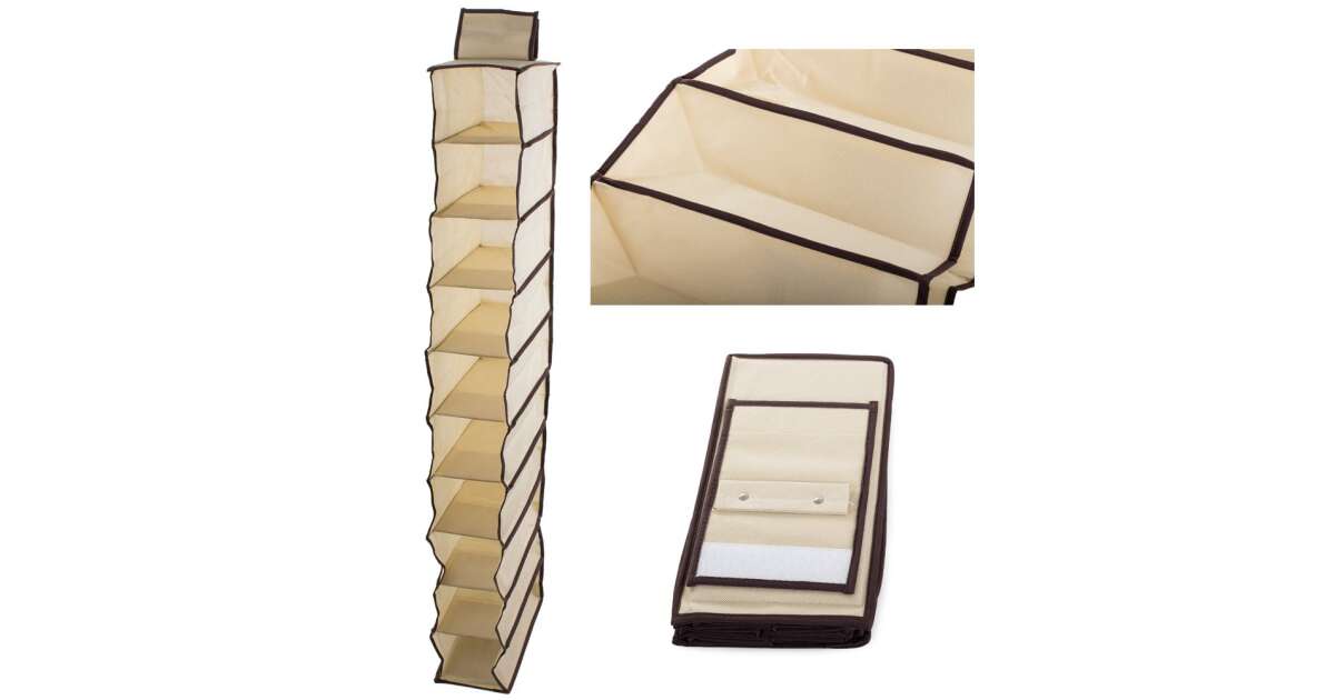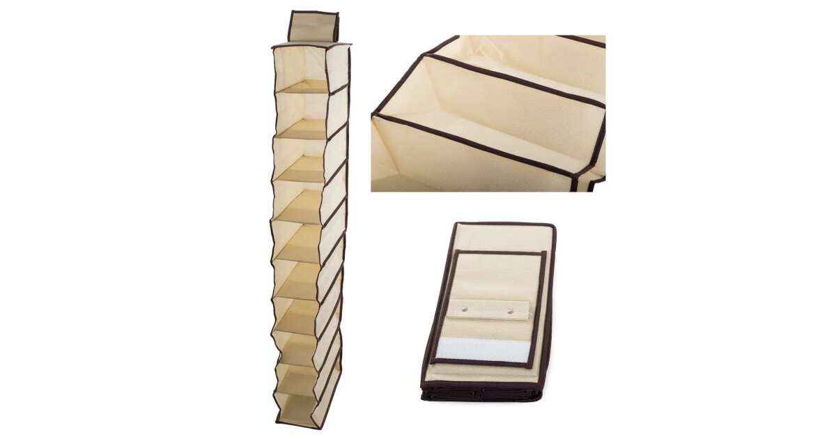 Ten 10-komorowy, wieszakowy organizer do szafy to świetny sposób na uporządkowanie ubrań, butów i dodatków. Bieżowy, wykonany z wytrzymałego materiału organizer łatwo zawiesisz w szafie i znacznie zwiększysz pojemność przechowywania. Dzięki dziesięciu równym przegródkom wszystko pozostanie na swoim miejscu, a Ty z łatwością znajdziesz to, czego potrzebujesz.