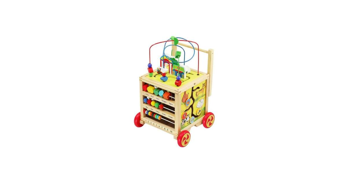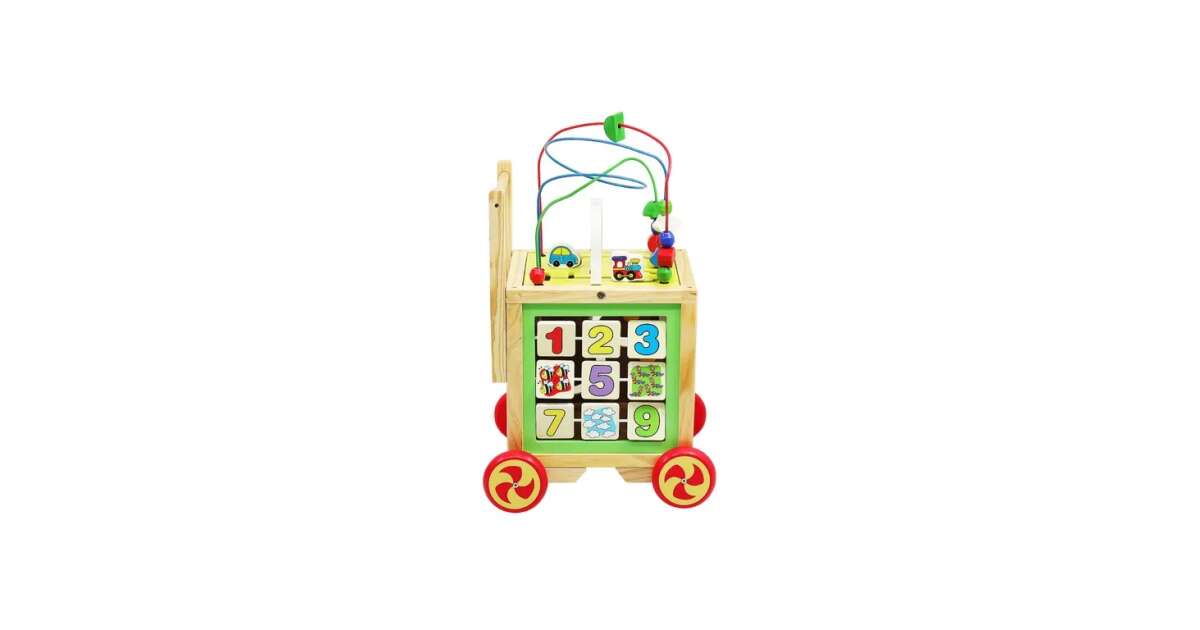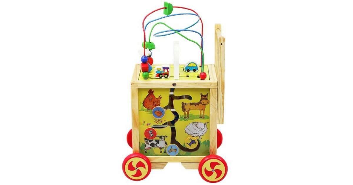 Wózek edukacyjny drewniany dla dzieci, interaktywna kostka do jeżdżenia + etykieta na terminal 100x150