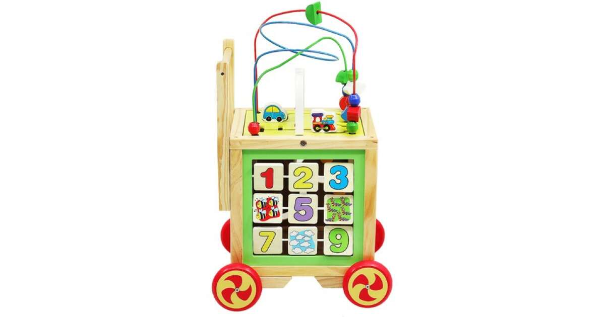 Wózek edukacyjny drewniany dla dzieci, interaktywna kostka do jeżdżenia + etykieta na terminal 100x150 opis