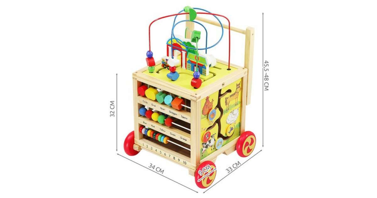 Ten piękny, kolorowy drewniany chodzik to coś więcej niż tylko zabawka – idealne narzędzie do rozwijania motoryki maluchów i pomagania im w stawianiu pierwszych samodzielnych kroków. Chodzik z kolorową kostką, jeżdżący na stabilnych kółkach, zapewnia wesołą zabawę i jednocześnie cenne doświadczenie edukacyjne.