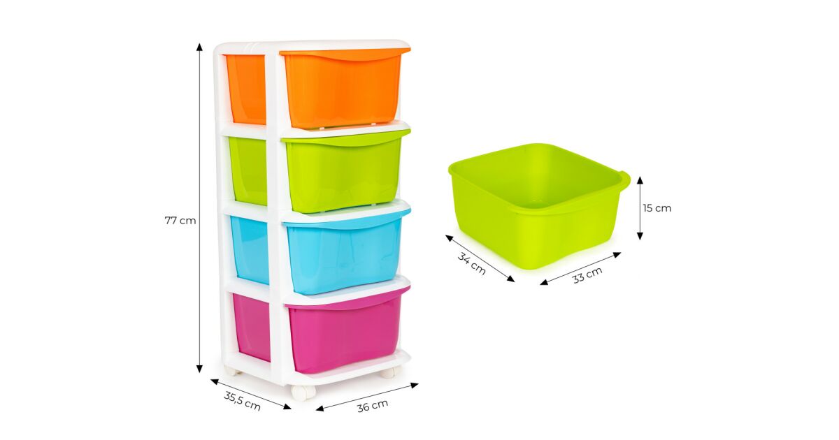 Ten kolorowy organizer z 4 szufladami to idealne rozwiązanie do przechowywania zabawek w pokoju dziecięcym lub kosmetyków i akcesoriów w łazience. Dzięki kółkom jest łatwy do przenoszenia, dzięki czemu można go elastycznie dopasować do układu pomieszczenia. Szuflady zamykają się bezpiecznie, zapobiegając wypadaniu, co jest szczególnie ważne, gdy używają go dzieci.