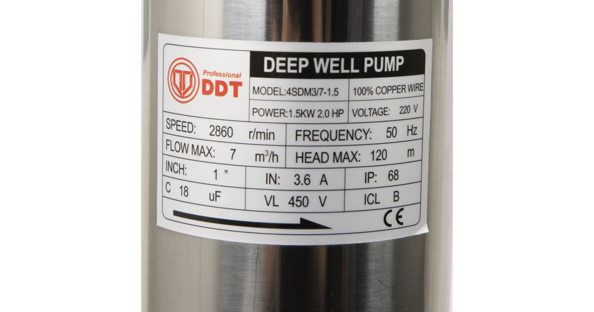 Pompa głębinowa DDT 4SDM3-7 to idealny wybór do zadań pompowania wody z głębokich studni. Konstrukcja ze stali nierdzewnej zapewnia długą żywotność, a silnik o mocy 1500 W i 7 turbin gwarantują wydajną pracę.