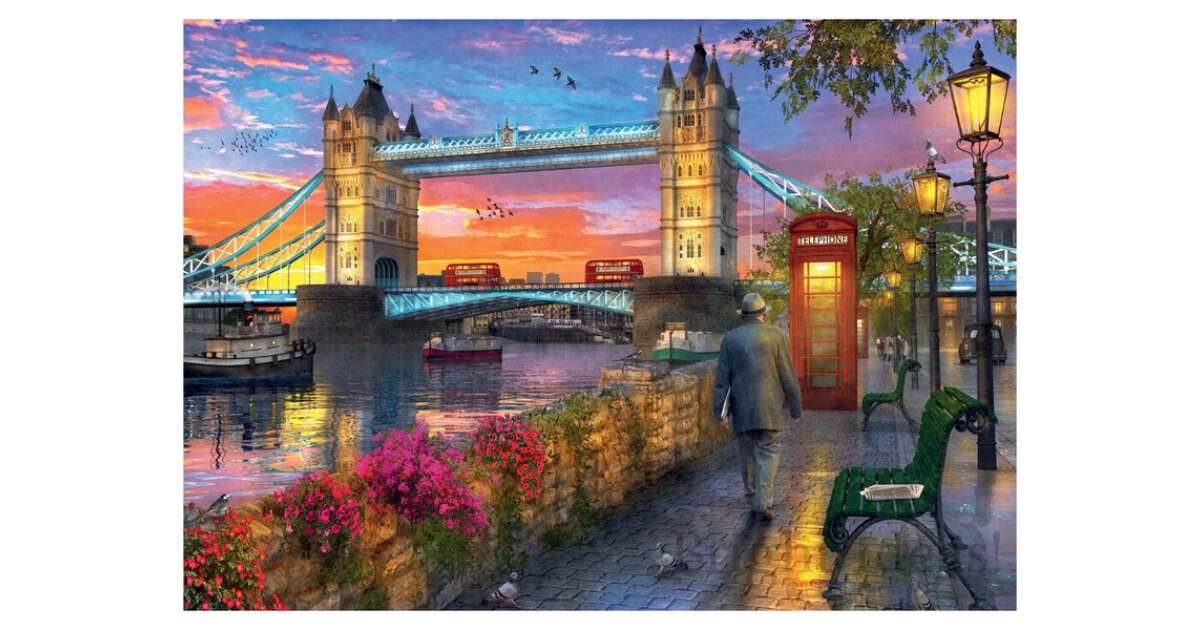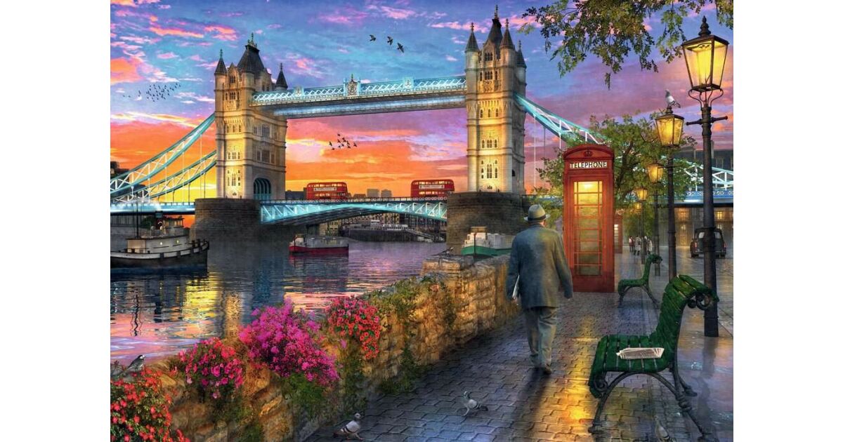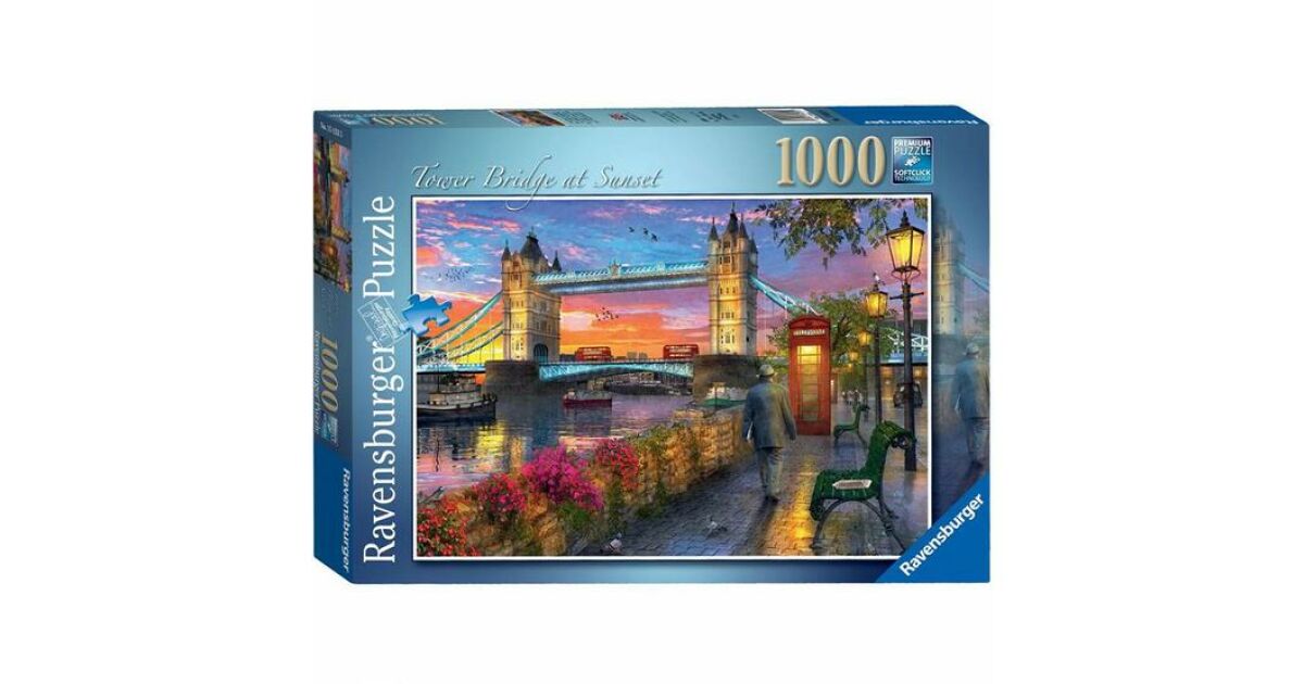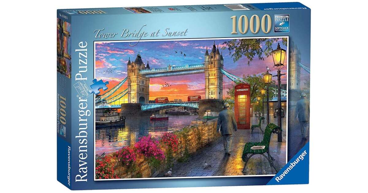 Ten piękny puzzle Ravensburger składa się z 1000 elementów i przedstawia londyński Tower Bridge w oszałamiających barwach zachodu słońca. Idealna rozrywka dla całej rodziny lub przyjemne zajęcie dla jednej osoby. Szczegółowy obraz gwarantuje godziny zabawy i ćwiczy koncentrację.