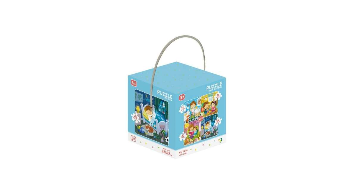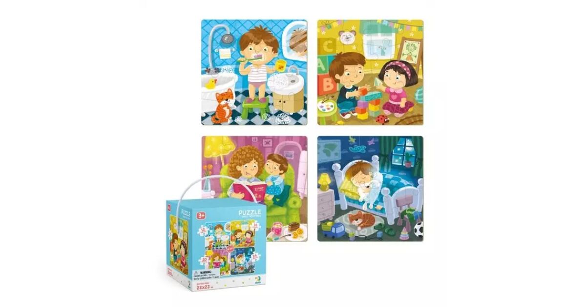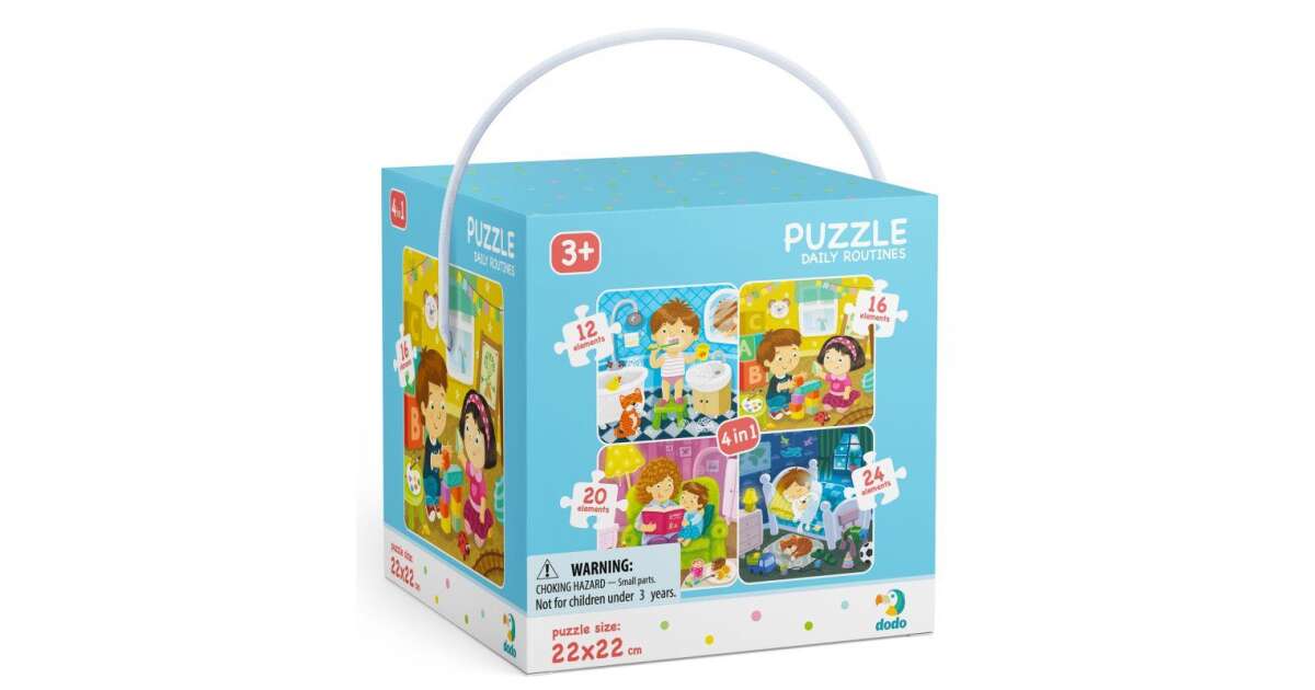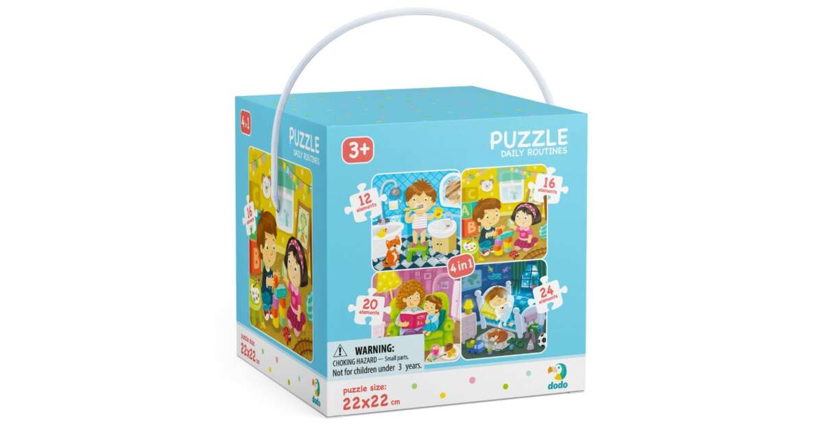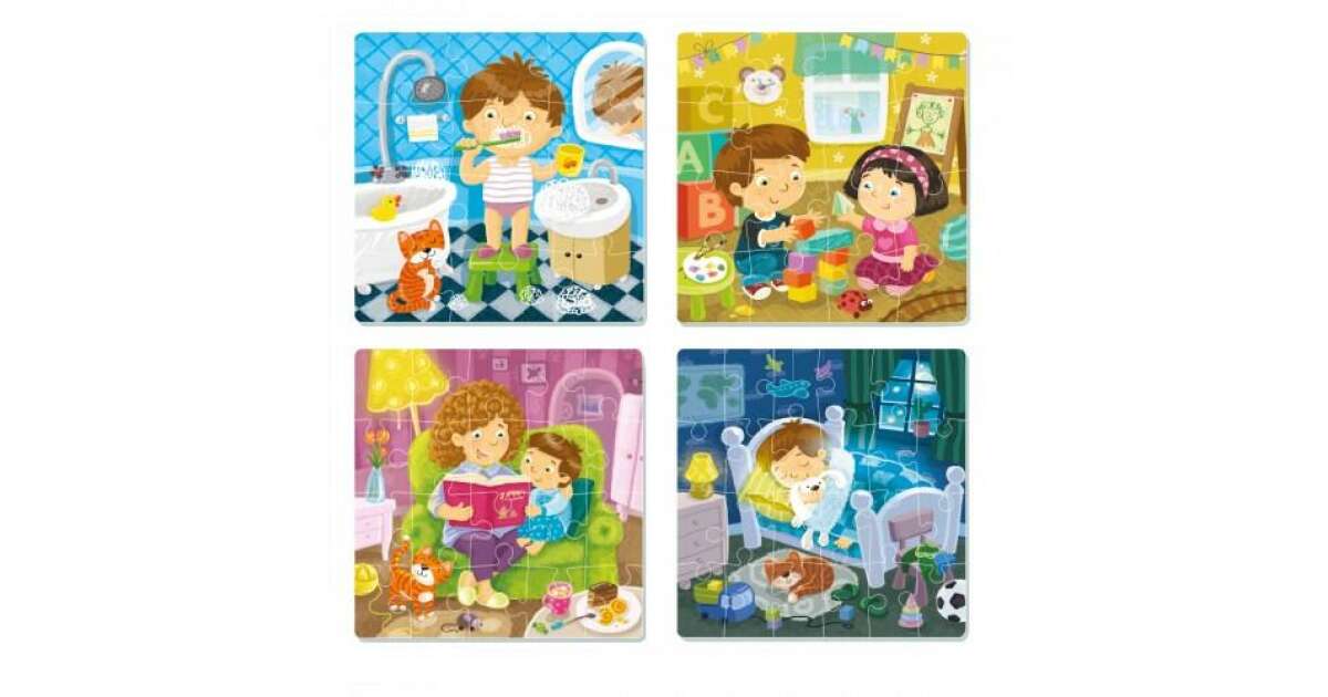 Te wesołe puzzle składające się z 72 elementów przedstawiają cztery różne obrazki, ukazujące ważne momenty z codziennej rutyny dziecka: przygotowania do śniadania, zabawa, czytanie i kładzenie się spać. Dzieci w przyjemny sposób mogą przyswoić kolejność codziennych czynności, jednocześnie rozwijając wyobraźnię, zdolności motoryczne i umiejętność rozwiązywania problemów.