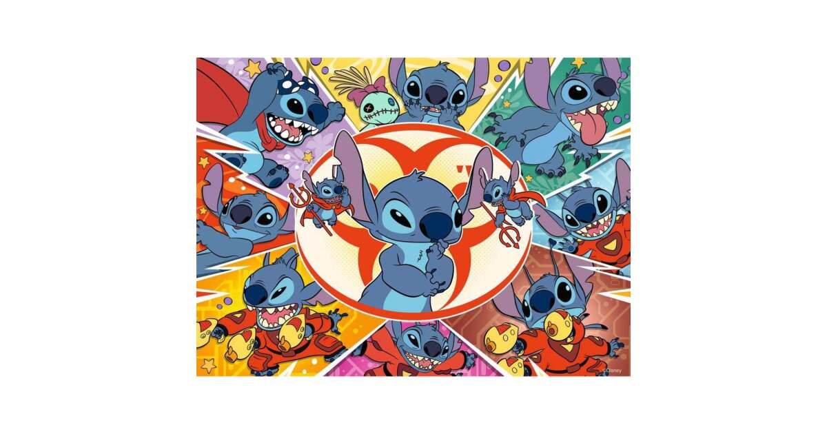 Ten 100-elementowy puzzle Ravensburger to gwarancja świetnej zabawy dla fanów Stitcha! Kolorowa, wesoła ilustracja przedstawia ukochanego bohatera z Lilo i Stitch w różnych śmiesznych sytuacjach.