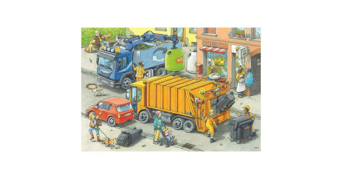 Te wesołe puzzle Ravensburger składające się z 48 elementów to idealny wybór dla dzieci w wieku od 4 lat! Rozwijają zdolności motoryczne, umiejętność rozwiązywania problemów i spostrzegawczość. Kolorowy, bogaty w szczegóły obraz przedstawia śmieciarki i zbiórkę śmieci, co zapewnia ekscytujące i pouczające wrażenia z zabawy.
