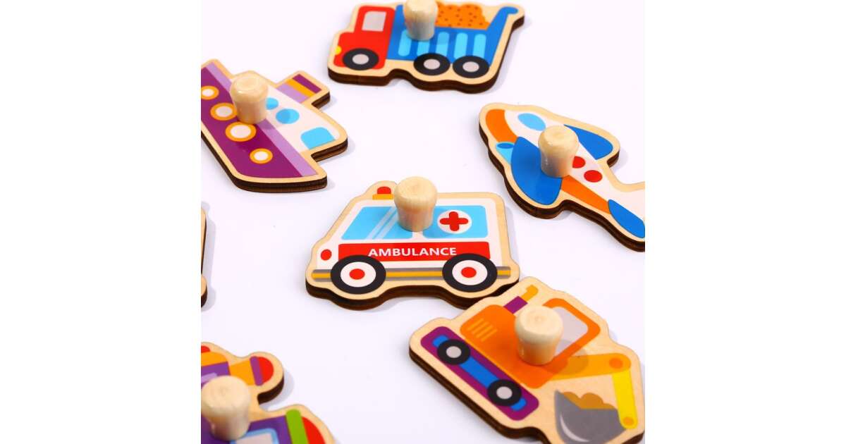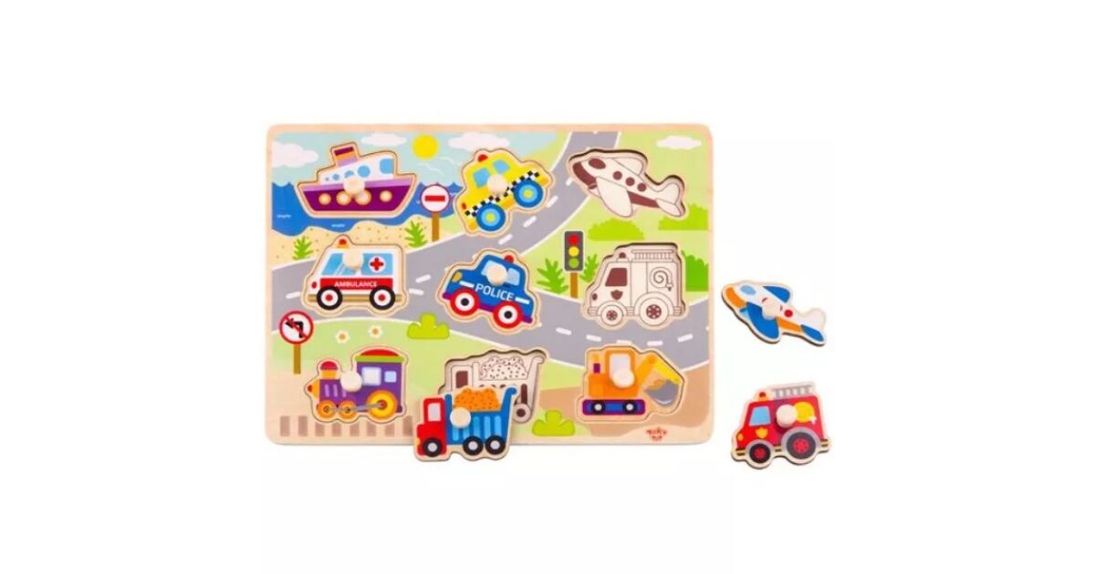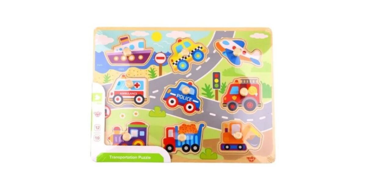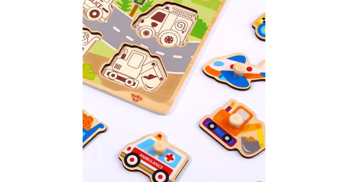 Te wesołe, drewniane puzzle składające się z 9 elementów to idealny wybór dla najmłodszych! Pomagają rozwijać motorykę małą, logikę i umiejętność rozwiązywania problemów. Kolorowe, urocze pojazdy – radiowóz, karetka, samolot, pociąg, statek, taksówka, wóz strażacki, koparka i wywrotka – z pewnością przyciągną uwagę maluchów.