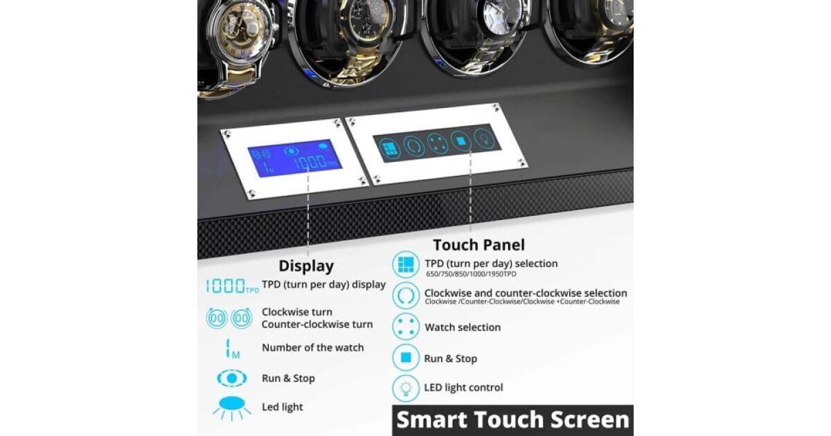 - 💡 Wewnętrzne oświetlenie LED: Doskonale oświetla zegarki, dzięki czemu zawsze są doskonale widoczne. Oświetlenie sterowane jest również pilotem.