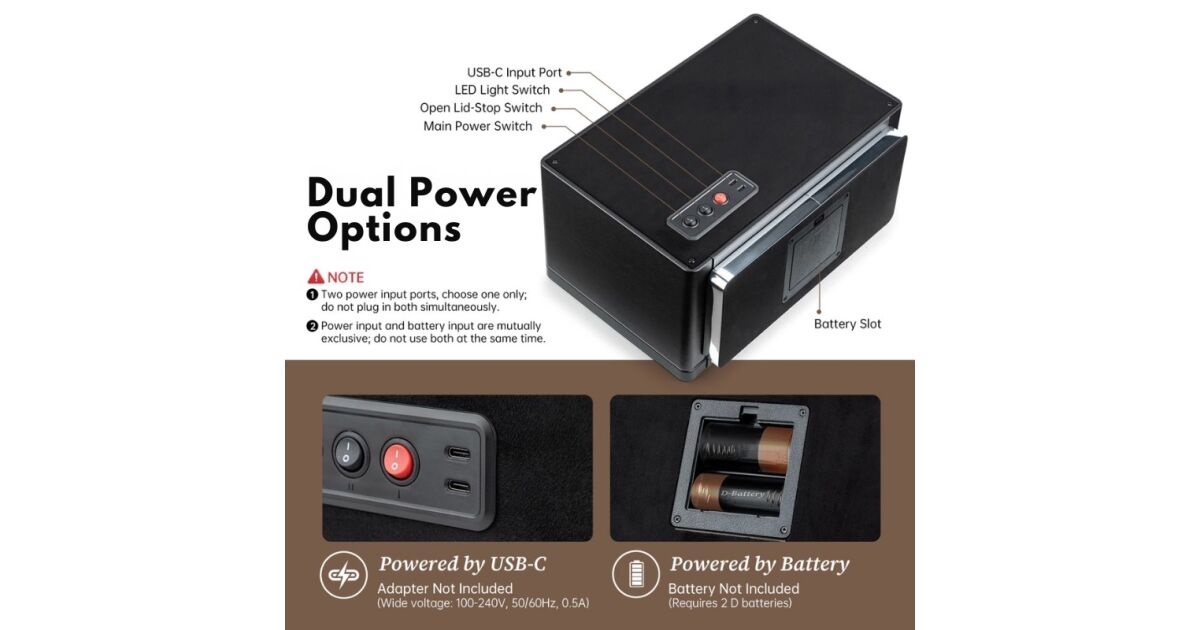 Podwójne zasilanie: przez USB-C (adapter nie jest dołączony) lub za pomocą 2 baterii D (nie są dołączone).