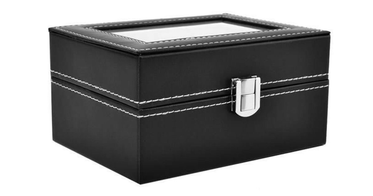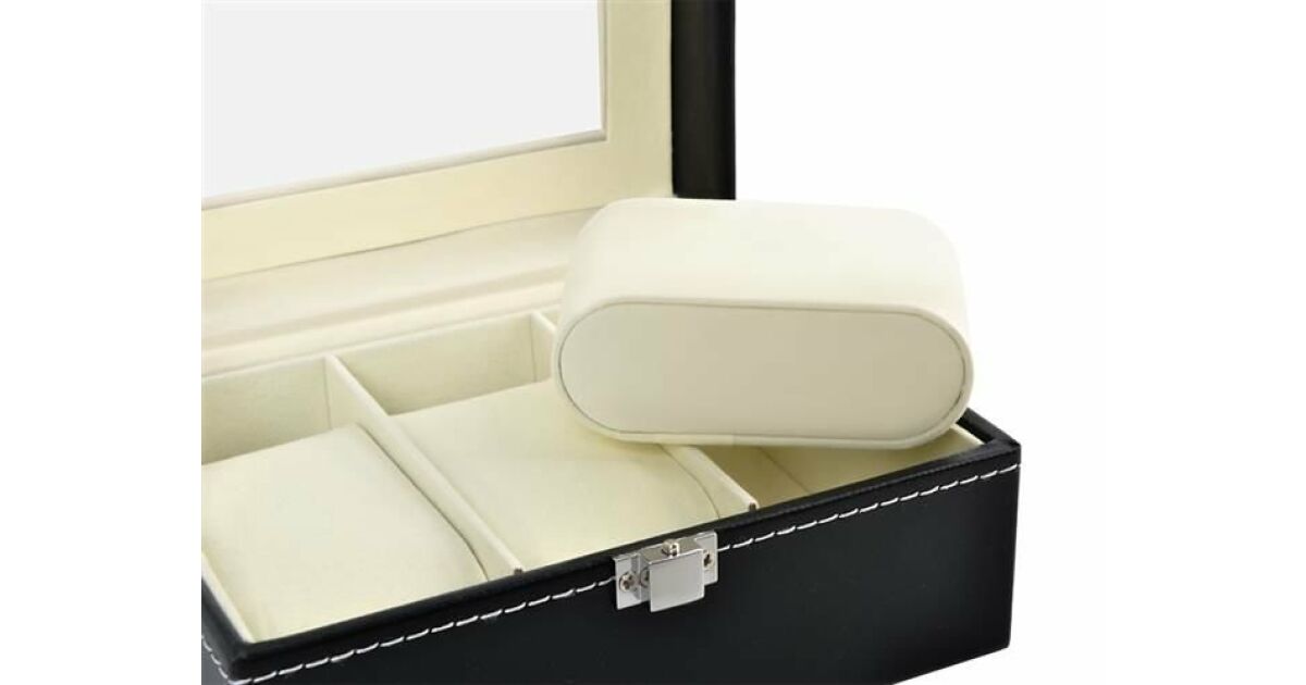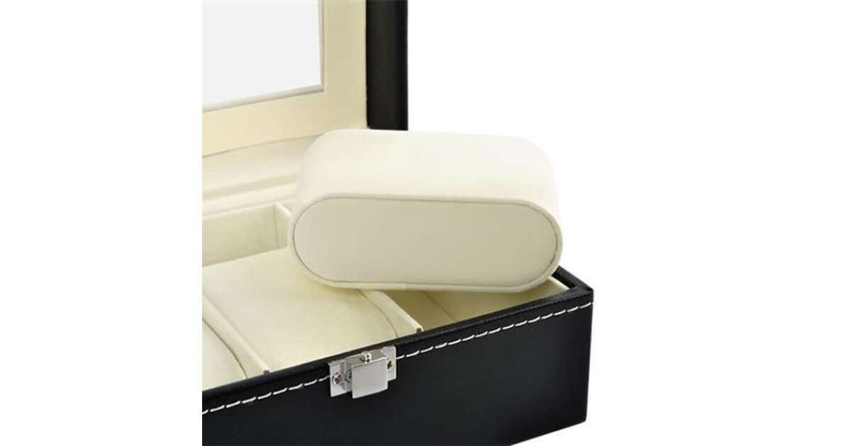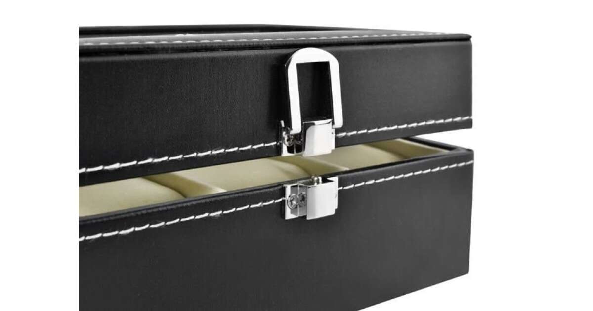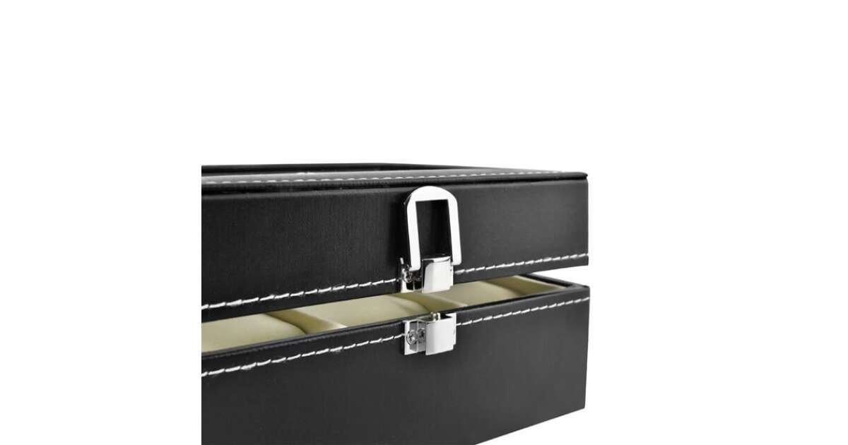 Ten stylowy organizer na zegarki to idealne miejsce na bezpieczne i eleganckie przechowywanie Twoich cennych zegarków i biżuterii. Wykonany z czarnej ekoskóry, z białymi kontrastowymi szwami i przezroczystą pokrywą, która pozwala na podgląd zawartości.