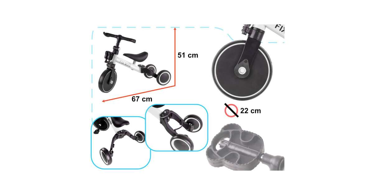 - 3 tryby użytkowania: rowerek biegowy, trójkołowy i rowerek z kołami blisko siebie, aby rozwijać równowagę.