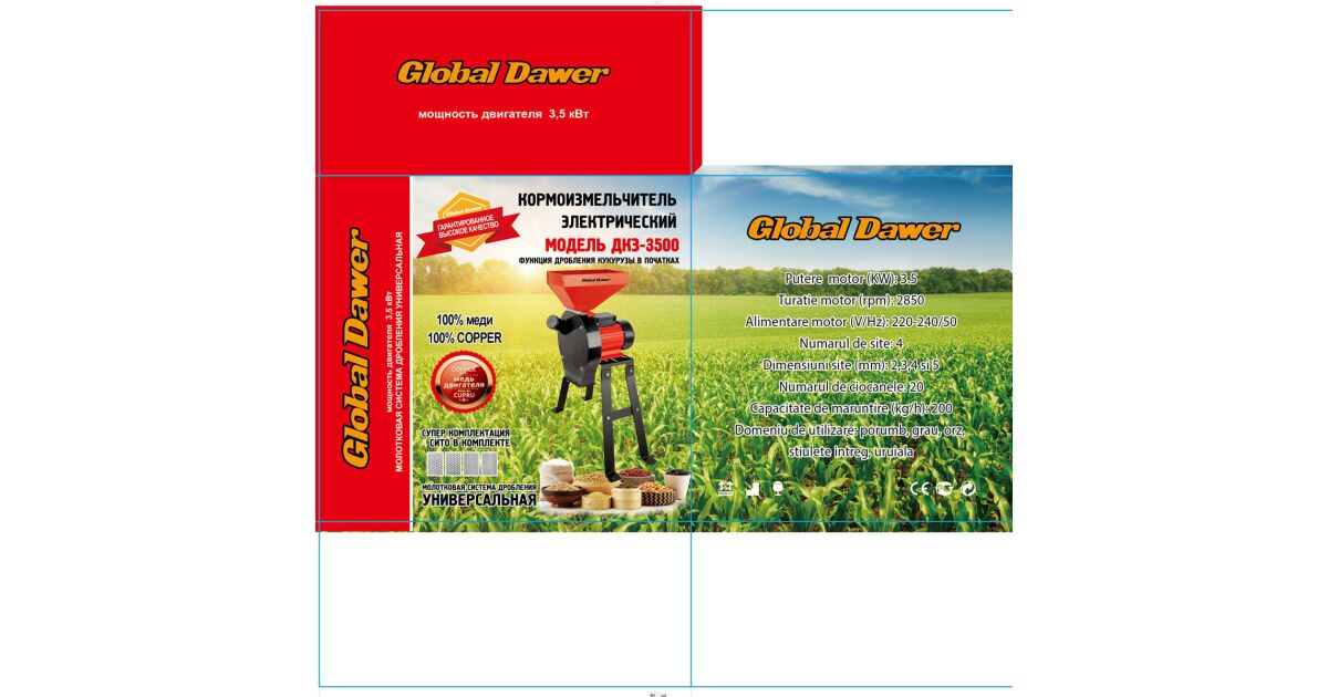 Młyn elektryczny z podporą do zbóż, ziaren i kolb (2 w 1), Global Dawer, 3500 W, 200 kg/h