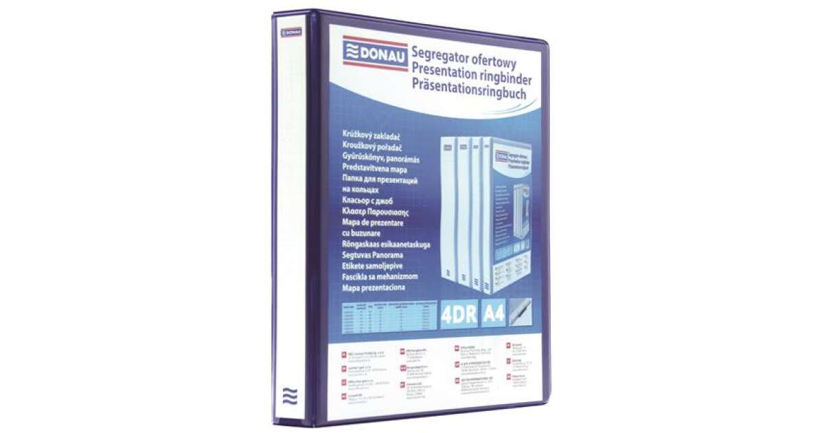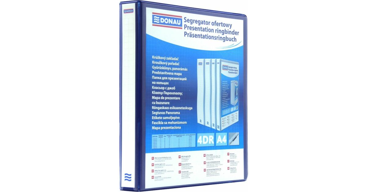 Segregator DONAU A4 44 mm w kształcie litery D panoramiczny 4 ringi PP niebieski opis