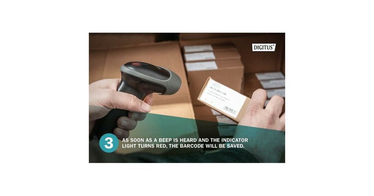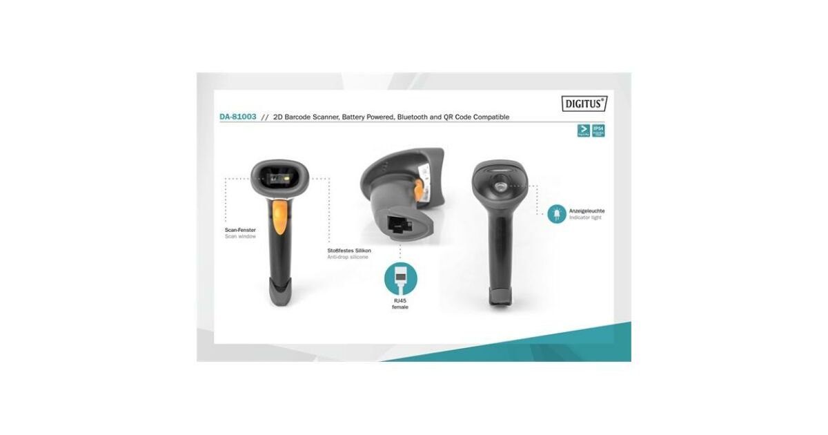 Digitus Ręczny skaner kodów kreskowych 2D, zasilany akumulatorem, kompatybilny z Bluetooth i kodami QR. Model: Ręczny czytnik kodów kreskowych, Typ skanera: 1D/2D, Typ przetwornika obrazu: CMOS. Technologia łączności: Przewodowa, Standardowe interfejsy: Bluetooth, RJ-45, USB, Długość kabla: 2 m. Kolor produktu: Czarny, Materiał obudowy: Kopolimer akrylonitrylo-butadieno-styrenowy (ABS), Poliwęglan (PC), Stopień ochrony IP: IP54. Rodzaj zasilania: Bateria, Technologia baterii: Litowo-jonowa (Li-Ion), Rodzaj baterii: Wbudowana bateria. Waga produktu: 150 g, Szerokość produktu: 63 mm, Głębokość produktu: 87 mm
