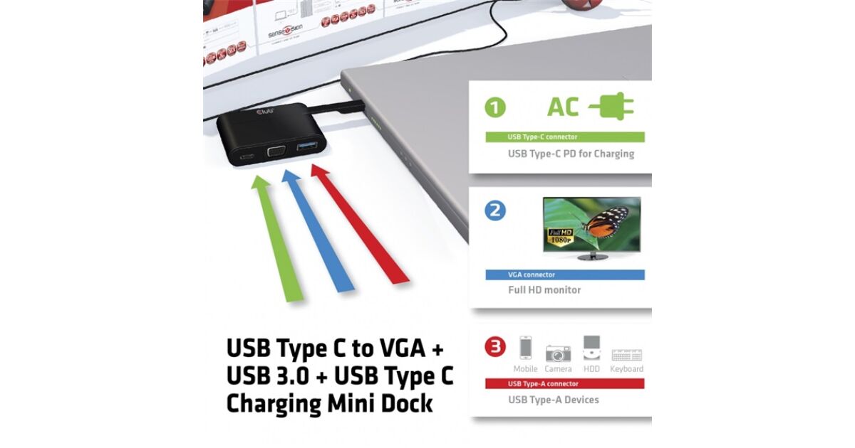 Club3D USB TYPE C 3.1 GEN 1 DO VGA + USB TYPE A 3.0 + ŁADOWARKA USB TYPE C 60W MINI DOK opis