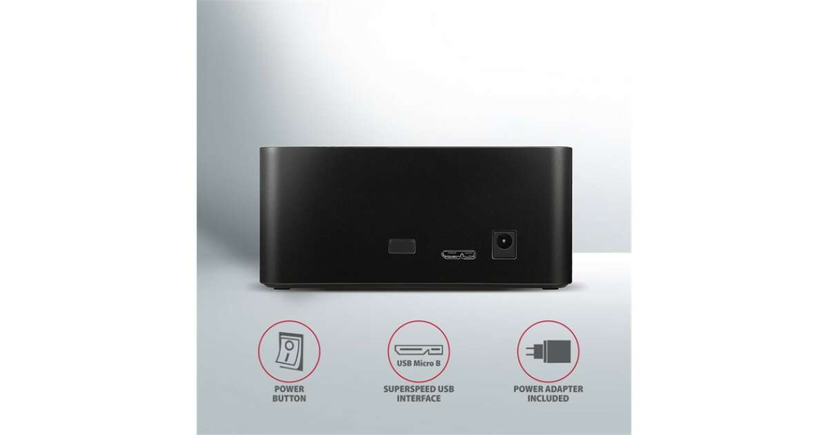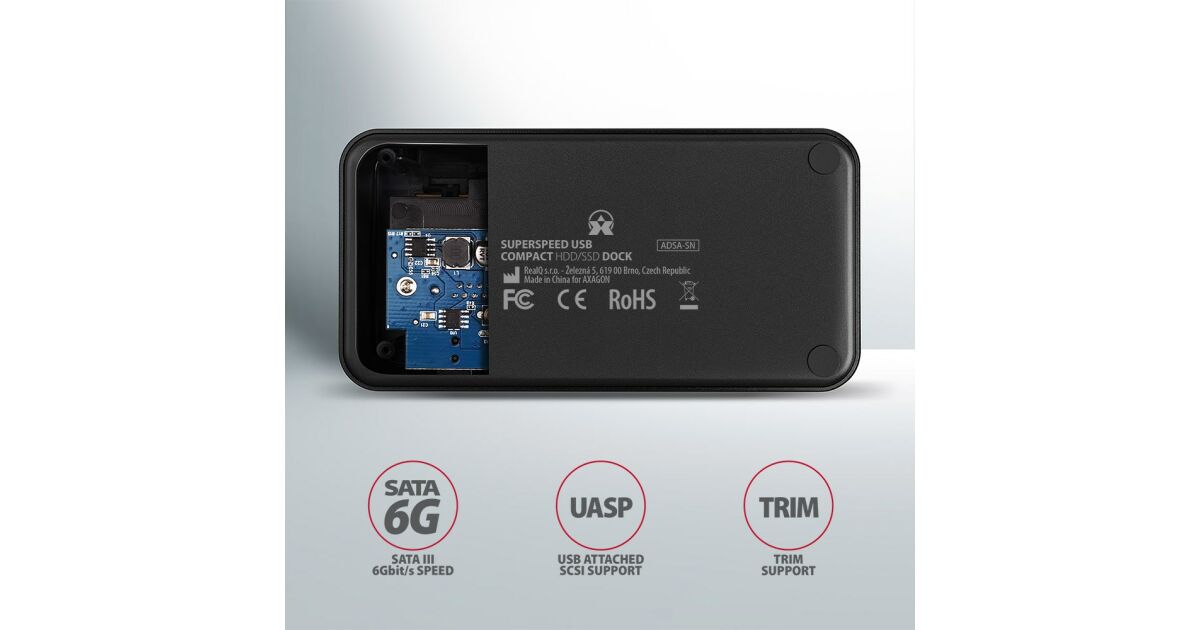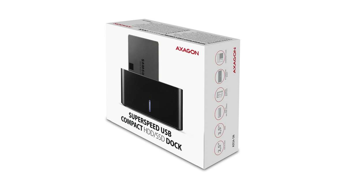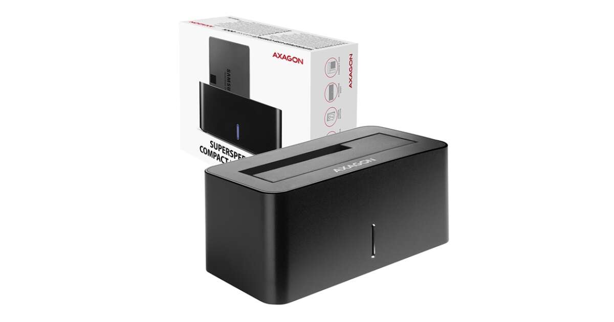 AXAGON ADSA-SNStacja dokująca SuperSpeed AXAGON ADSA-SN COMPACT HDD/SSD DOCK przyłączy do komputera w prosty i szybki sposób dowolny dysk SATA.Sprytny pomocnik do najprostszego i najszybszego sposobu przyłączenia dowolnych dysków SATA do komputera - dysk wystarczy wsunąć do podstawy. Z instalacją poradzi sobie nawet całkowity amator.Interfejs SATA 6G ze wsparciem UASP umożliwi wykorzystanie szybkości nowoczesnych dysków SSD. Wsparcie funkcji TRIM do ograniczenia powolnej degradacji wydajności SSD w czasie. Czytanie informacji S.M.A.R.T. monitorujących kondycję przyłączonych dysków. Wsparcie usypiania przyłączonych dysków i stacji dokującej.Nisko umieszczony punkt ciężkości stacji dokującej do doskonałej stabilności. Gumowe nóżki do ograniczenia wibracji. Nowoczesny minimalistyczny design pudła z obudową z aluminium.Specyfikacja techniczna:Gwarancja producenta: 24 miesiąceInterfejs: USB 3.1 Gen 1Kompatybilność: SATA 2.5/3.5 SSD/HDDWymiary: 130 x 65 x 59 mmKolor: czarnyMasa: 190 g