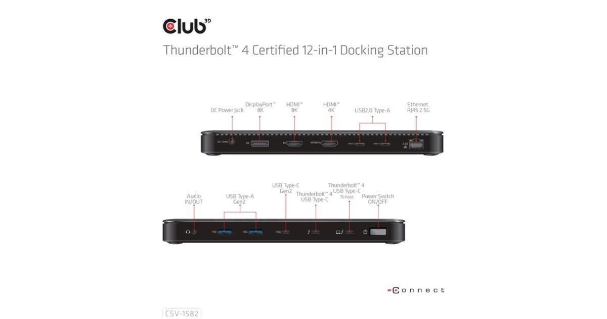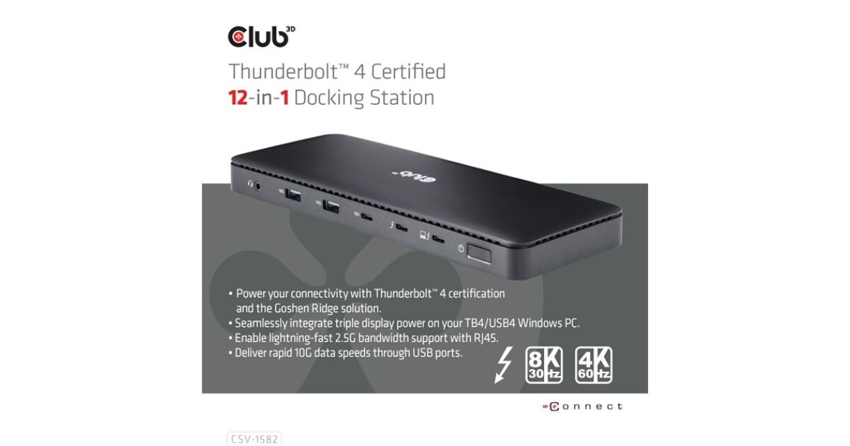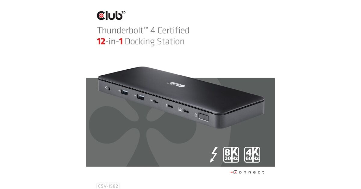 Club 3D CSV-1582 to stacja dokująca 12 w 1 Thunderbolt 4, która jest idealnym rozwiązaniem dla Twojego notebooka. Łatwo podłącz wszystkie urządzenia peryferyjne i ciesz się błyskawicznym transferem danych i wysokiej jakości wyjściami wideo.