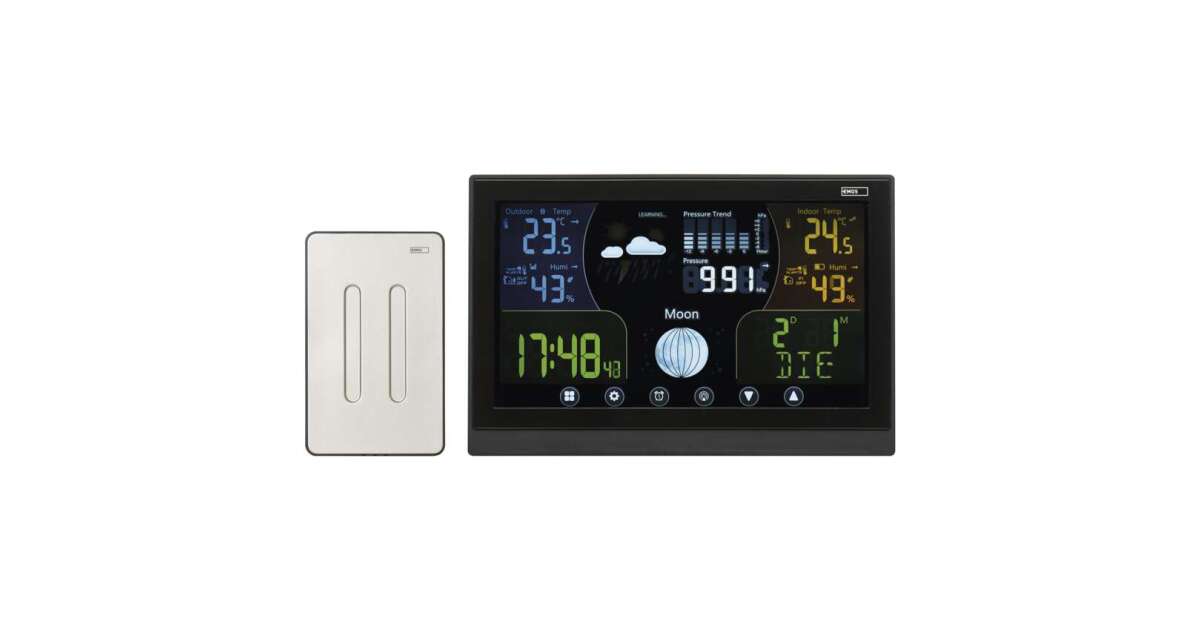 Ta bezprzewodowa stacja pogodowa nie tylko dostarcza precyzyjnych informacji o temperaturze wewnętrznej i zewnętrznej, wilgotności i ciśnieniu powietrza, ale także posiada elegancki, kolorowy wyświetlacz, który został doceniony przez klientów. Radiosterowany zegar DCF zawsze pokazuje dokładny czas, a wbudowany budzik posiada funkcję powtarzania alarmu.