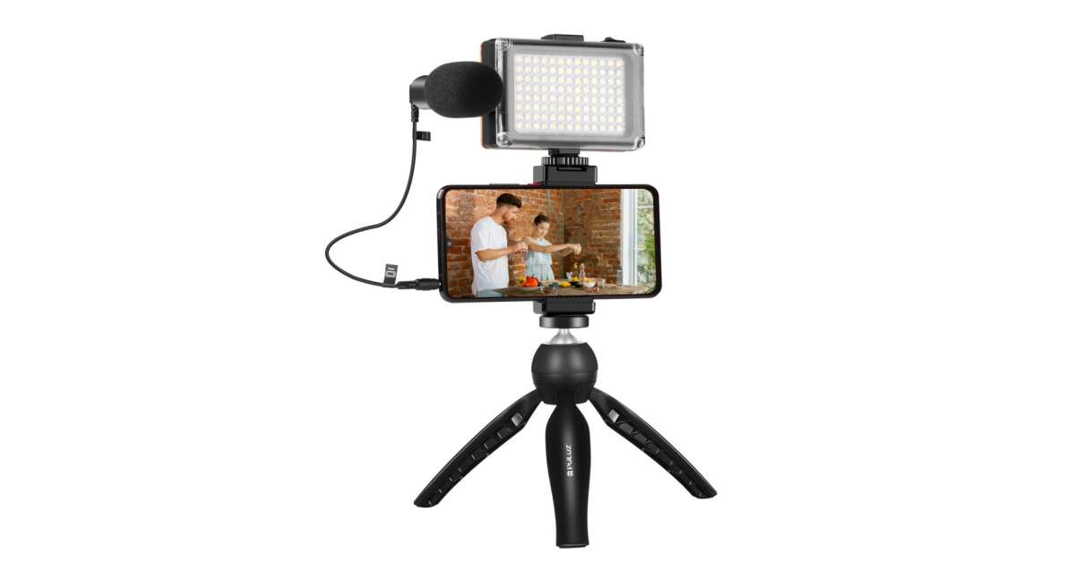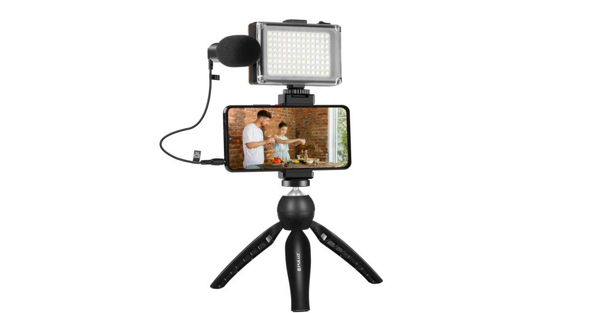 Zestaw do transmisji na żywo Puluz, mocowanie do statywu, oświetlenie LED, mikrofon, uchwyt na telefon opis