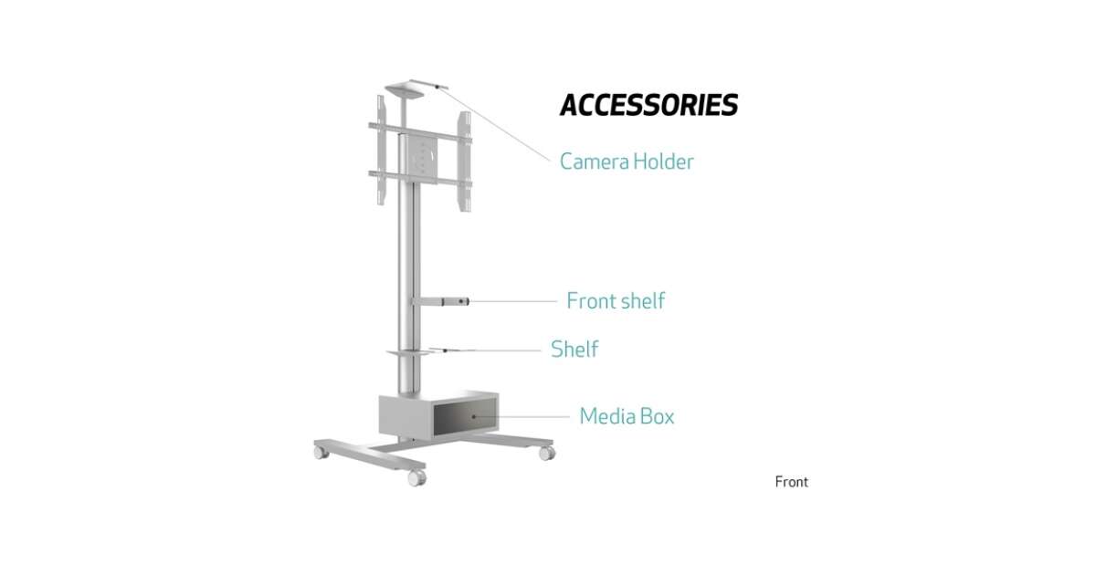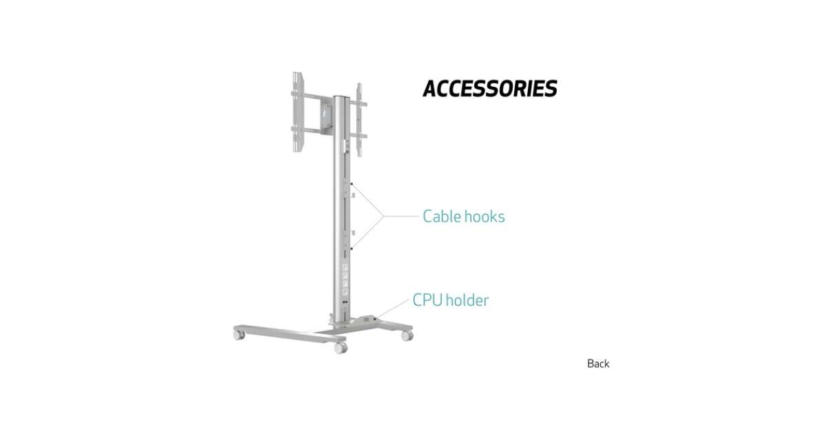 Ten stojak jezdny to idealne rozwiązanie dla ekranów o przekątnej od 55 do 80 cali, niezależnie od tego, czy używasz go do prezentacji, tablicy cyfrowej czy wyświetlacza informacyjnego. Dzięki kółkom łatwo go przesuwać, a jego wysokość jest regulowana.
