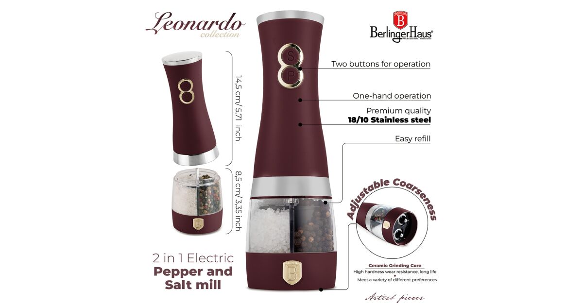 Berlinger Haus BH-9644 Elektryczny młynek do soli i pieprzu 2w1 z kolekcji Leonardo - Bordeaux