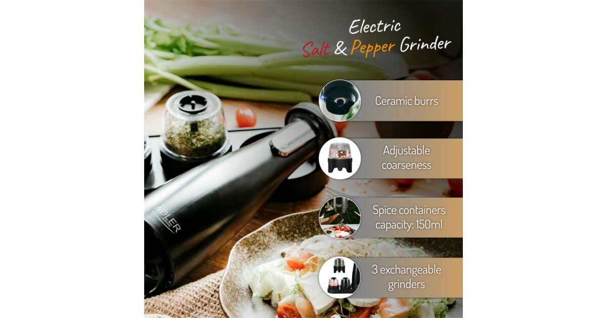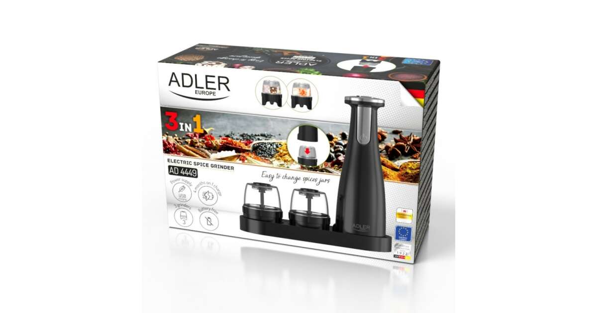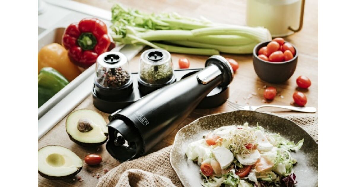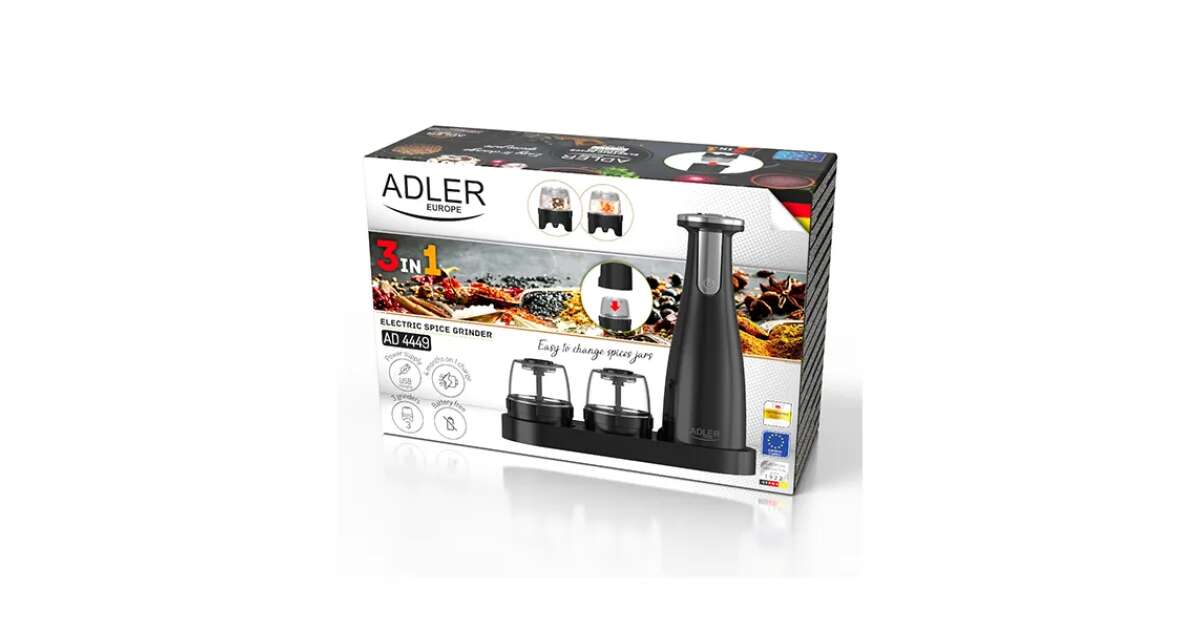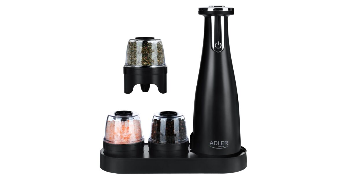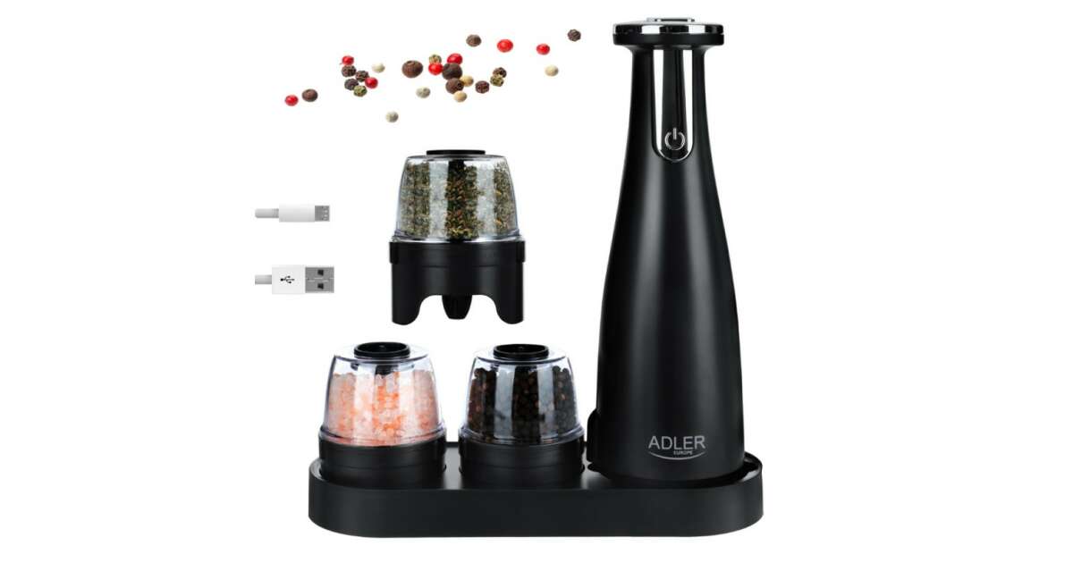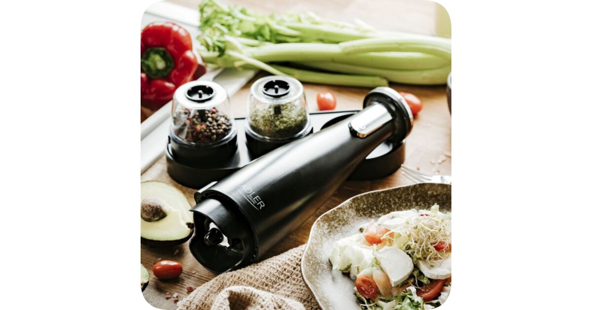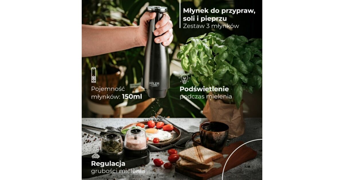 Zestaw młynków do przypraw 3 w 1 został zaprojektowany z myślą o Twojej wygodzie, wyróżnia się połączeniem trzech młynków w zestawie. Elektryczny młynek AD 4449 jest wyjątkowo wygodny i prosty w obsłudze. Ma też kilka ciekawych funkcji. Na przykład możesz swobodnie regulować grubość mielenia przypraw. Jest to przydatne, jeśli jeden z domowników lubi grubo mieloną sól, a inny woli drobno mielony pieprz. Z kolei podświetlona baza ułatwia kontrolowanie tego, gdzie przyprawy trafiają i ile jeszcze należy ich zmielić. Baza jest wyposażona w diodę LED, która automatycznie zapala się podczas używania, umożliwiając wyraźny widok tego, gdzie i ile przypraw dodajesz do posiłku. Pojemność jednego młynka to 150 ml, więc nie musisz martwić się regularnym ich uzupełnianiem. Urządzenie ładujesz przewodem USB i po 2,5h możesz w pełni korzystać z jego funkcji. Świeżo mielone przyprawy i zioła mają intensywny smak i aromat, który może znacznie poprawić smak potraw. Elektryczny młynek do soli i pieprzu Adler jest łatwy w użyciu, prosty w utrzymaniu i wykonany z myślą o długotrwałym użytkowaniu, co czyni go idealnym wyborem do każdej kuchni.