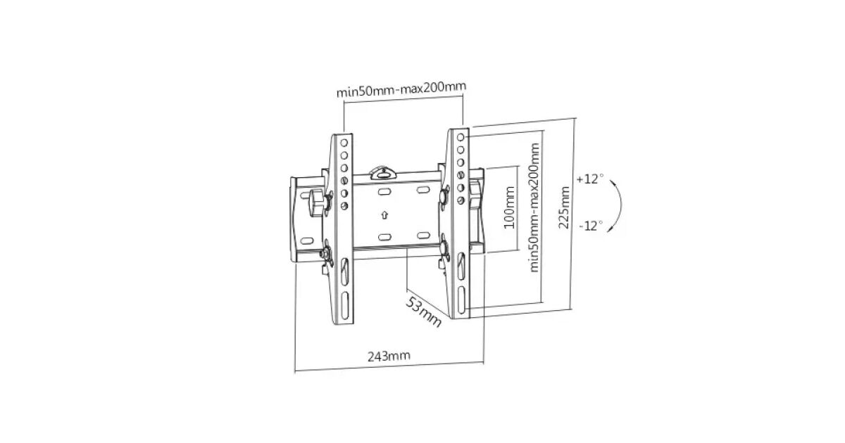 Uchwyt ścienny do telewizora (regulowany), 23"-42"Idealnie ustawiony TV Lekka i zwarta konstrukcja Wytrzymały stalowy regulowany uchwyt ścienny do telewizora Obsługuje większość telewizorów LCD o przekątnej od 23 do 42 cali Zgodność ze standardem VESA (200 x 200 mm) Odległość od ściany 53 mm Umożliwia przechylanie do 24 stopni Praktyczna zintegrowana poziomica do idealnego wyrównania Zawiera wszystkie niezbędne materiały instalacyjne Informacje o produkcie Przeznaczenie Telewizory Rodzaj Ścienny Przekątna ekranu (min.) 23 '' Przekątna ekranu (maks.) 42 '' Standard VESA 200 x 200 75 x 75 100 x 100 200 x 100 Obciążenie (maks.) 30 kg Regulacja wysięgu Nie Uchwyt narożny Nie Materiał Stal Kolor Czarny Wymiary Wykończenie powierzchni: malowanie proszkowe Profil: 53 mm Zakres pochylenia: +12° ~ -12° Waga 1 kg Pozostałe parametry Wykończenie powierzchni: malowanie proszkowe Rozmiar ekranu: 23 "- 42" Profil: 53 mm Zakres pochylenia: +12° ~ -12°