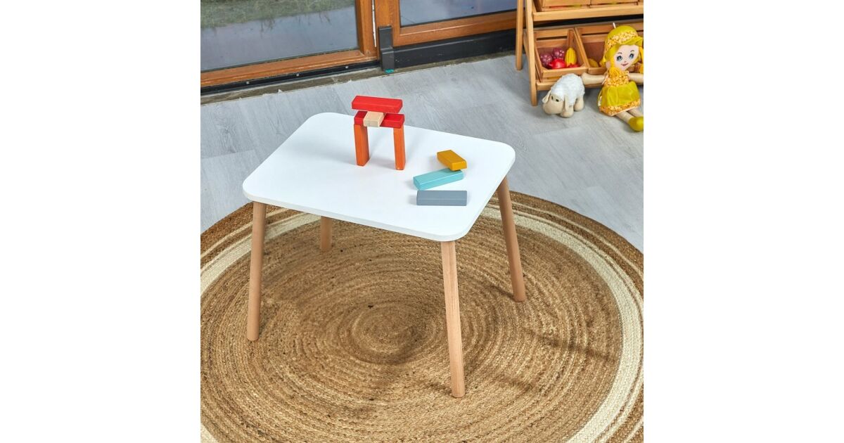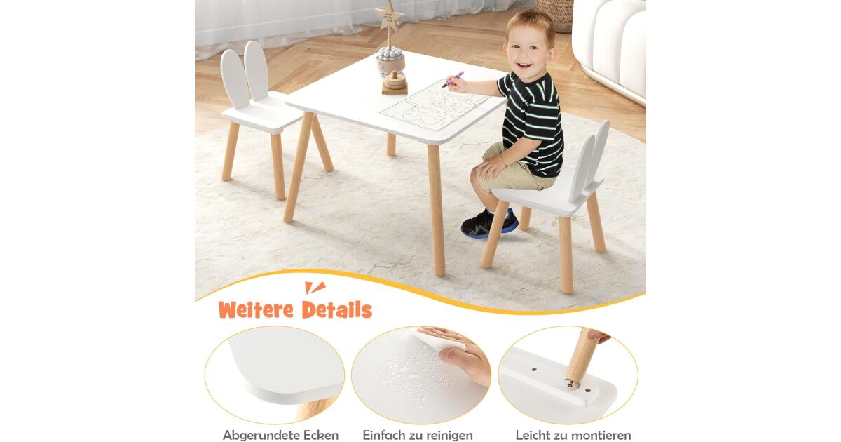 Drewniany stolik dla dzieci z 2 krzesełkami – Zestaw BUNNY do nauki, rysowania, zabawy i posiłków, do pokoju dziecięcego, w kolorze białym