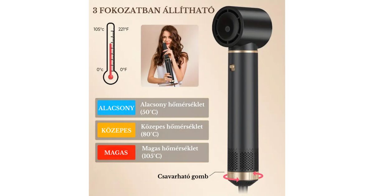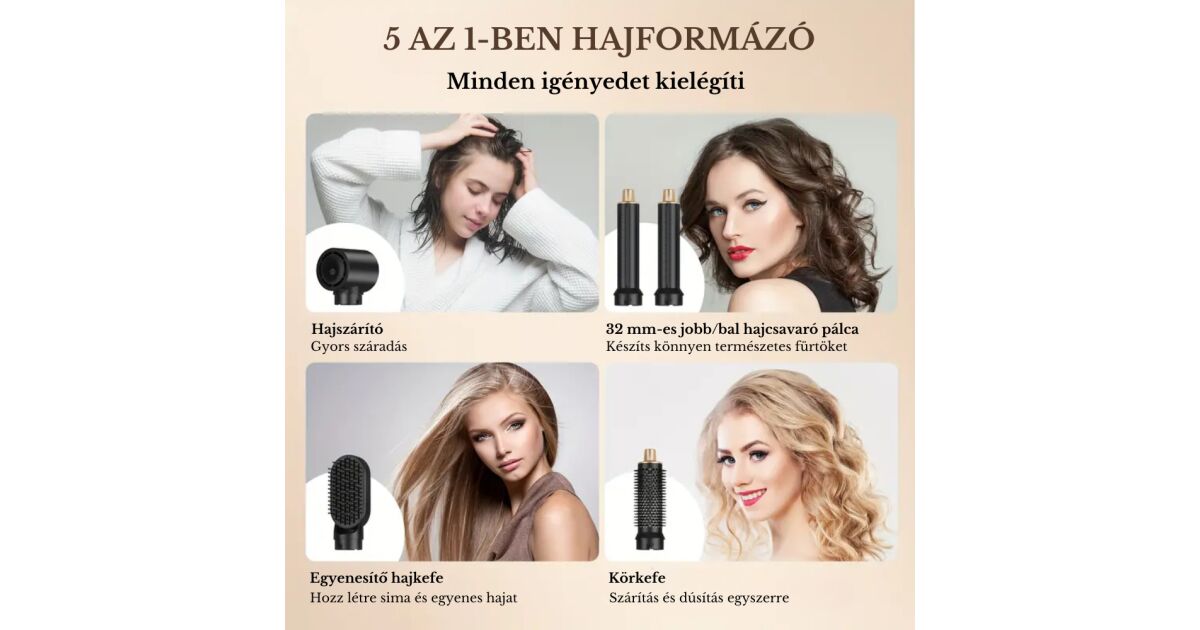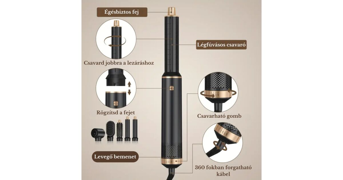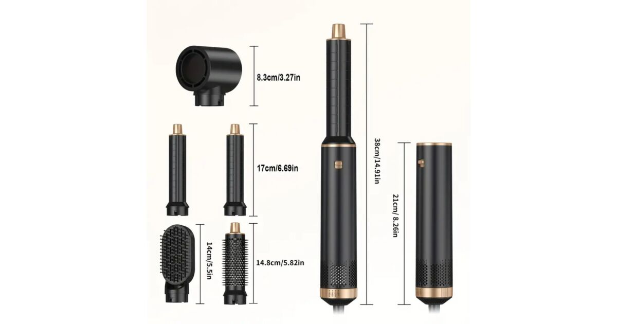 - 5 wymiennych głowic: suszarka do włosów, szczotka prostująca, okrągła szczotka, lokówka 32 mm i 8,5 mm