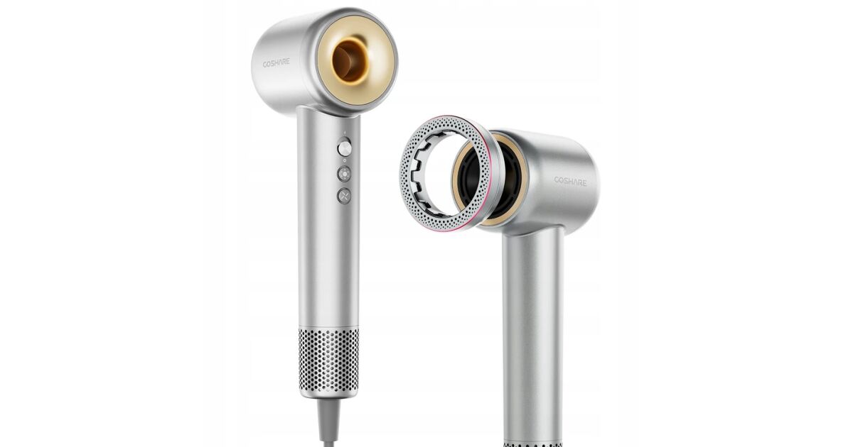 Suszarka do włosów COSHARE HD10, ShineRing, jony ujemne, 110 000 obr./min, mocna, kontrola termiczna, niski poziom hałasu, srebrna opis